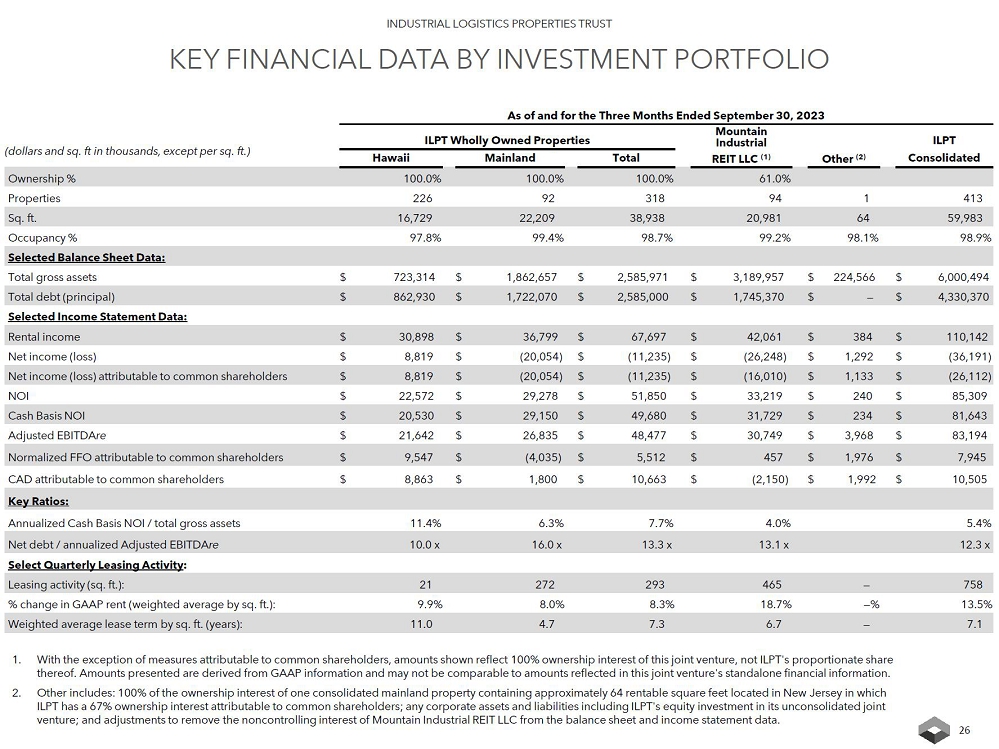 25 INDUSTRIAL LOGISTICS PROPERTIES TRUST CALCULATION OF FFO, NORMALIZED FFO AND CAD ATTRIBUTABLE TO COMMON SHAREHOLDERS (continued) (dollars and shares in thousands, except per share data) For the Three Months Ended For the Nine Months Ended 9/30/2023 6/30/2023 3/31/2023 12/31/2022 9/30/2022 9/30/2023 9/30/2022 Normalized FFO attributable to common shareholders $ 7,945 $ 7,594 $ 7,916 $ 5,440 $ 14,873 $ 23,455 $ 70,778 Add (less): Non-cash interest expense 12,884 12,861 12,853 13,123 4,658 38,598 11,368 Non-cash revenues (3,666) (3,597) (4,032) (3,647) (4,044) (11,295) (12,435) Non-cash expenses 476 567 387 401 618 1,430 1,820 Recurring capital expenditures (3,961) (3,781) (2,410) (6,590) (3,594) (10,152) (10,068) Principal amortization (4,385) (5,168) (5,530) (5,479) (5,429) (15,083) (12,590) Share of Normalized FFO from unconsolidated joint venture (1,446) (1,502) (1,468) (1,291) (1,678) (4,416) (5,115) Distributions from unconsolidated joint venture 990 990 990 1,320 1,320 2,970 3,962 CAD adjustments attributable to noncontrolling interest 1,668 1,839 1,476 1,471 1,566 4,983 3,207 CAD attributable to common shareholders $ 10,505 $ 9,803 $ 10,182 $ 4,748 $ 8,290 $ 30,490 $ 50,927 Weighted average common shares outstanding (basic and diluted) 65,488 65,369 65,309 65,307 65,250 65,389 65,228 Per Common Share Data (basic and diluted): Net loss per share attributable to common shareholders $ (0.40) $ (0.40) $ (0.38) $ (0.48) $ (0.70) $ (1.17) $ (3.00) FFO per share attributable to common shareholders $ 0.12 $ 0.11 $ 0.12 $ 0.08 $ (0.16) $ 0.36 $ (0.06) Normalized FFO attributable to common shareholders $ 0.12 $ 0.12 $ 0.12 $ 0.08 $ 0.23 $ 0.36 $ 1.09 CAD attributable to common shareholders $ 0.16 $ 0.15 $ 0.16 $ 0.07 $ 0.13 $ 0.47 $ 0.78