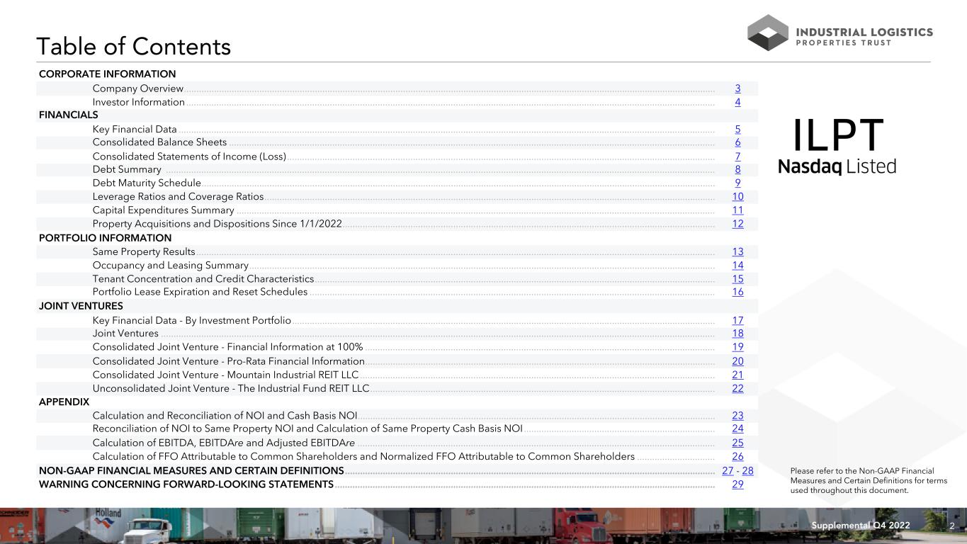 1 Supplemental Operating and Financial Data ALL AMOUNTS IN THIS REPORT ARE UNAUDITED. FOURTH QUARTER 2022 Exhibit 99.2 5 Logistics Drive Carlisle, PA 205,090 Square Feet ILPT Ownership: 22%
