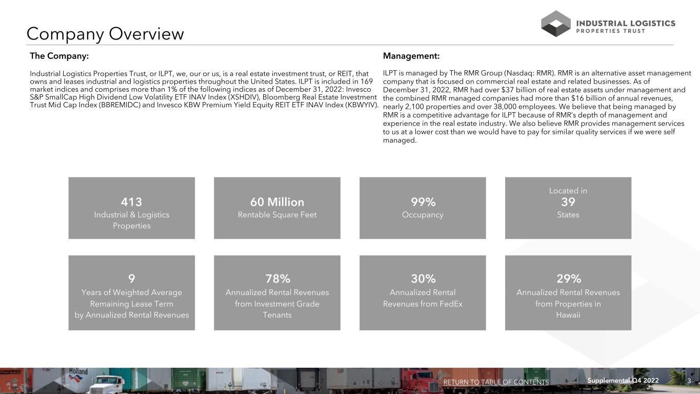 3Supplemental Q4 2022 The Company: Industrial Logistics Properties Trust, or ILPT, we, our or us, is a real estate investment trust, or REIT, that owns and leases industrial and logistics properties throughout the United States. ILPT is included in 169 market indices and comprises more than 1% of the following indices as of December 31, 2022: Invesco S&P SmallCap High Dividend Low Volatility ETF INAV Index (XSHDIV), Bloomberg Real Estate Investment Trust Mid Cap Index (BBREMIDC) and Invesco KBW Premium Yield Equity REIT ETF INAV Index (KBWYIV). Management: ILPT is managed by The RMR Group (Nasdaq: RMR). RMR is an alternative asset management company that is focused on commercial real estate and related businesses. As of December 31, 2022, RMR had over $37 billion of real estate assets under management and the combined RMR managed companies had more than $16 billion of annual revenues, nearly 2,100 properties and over 38,000 employees. We believe that being managed by RMR is a competitive advantage for ILPT because of RMR’s depth of management and experience in the real estate industry. We also believe RMR provides management services to us at a lower cost than we would have to pay for similar quality services if we were self managed. Company Overview RETURN TO TABLE OF CONTENTS Located in 413 60 Million 99% 39 Industrial & Logistics Rentable Square Feet Occupancy States Properties 9 78% 30% 29% Years of Weighted Average Annualized Rental Revenues Annualized Rental Annualized Rental Revenues Remaining Lease Term from Investment Grade Revenues from FedEx from Properties in by Annualized Rental Revenues Tenants Hawaii