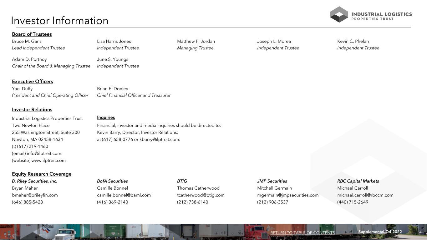4Supplemental Q4 2022 Investor Information Investor Relations Industrial Logistics Properties Trust Inquiries Two Newton Place Financial, investor and media inquiries should be directed to: 255 Washington Street, Suite 300 Kevin Barry, Director, Investor Relations, Newton, MA 02458-1634 at (617) 658-0776 or kbarry@ilptreit.com. (t) (617) 219-1460 (email) info@ilptreit.com (website) www.ilptreit.com RETURN TO TABLE OF CONTENTS Board of Trustees Bruce M. Gans Lisa Harris Jones Matthew P. Jordan Joseph L. Morea Kevin C. Phelan Lead Independent Trustee Independent Trustee Managing Trustee Independent Trustee Independent Trustee Adam D. Portnoy June S. Youngs Chair of the Board & Managing Trustee Independent Trustee Equity Research Coverage B. Riley Securities, Inc. BofA Securities BTIG JMP Securities RBC Capital Markets Bryan Maher Camille Bonnel Thomas Catherwood Mitchell Germain Michael Carroll bmaher@brileyfin.com camille.bonnel@baml.com tcatherwood@btig.com mgermain@jmpsecurities.com michael.carroll@rbccm.com (646) 885-5423 (416) 369-2140 (212) 738-6140 (212) 906-3537 (440) 715-2649 Executive Officers Yael Duffy Brian E. Donley President and Chief Operating Officer Chief Financial Officer and Treasurer