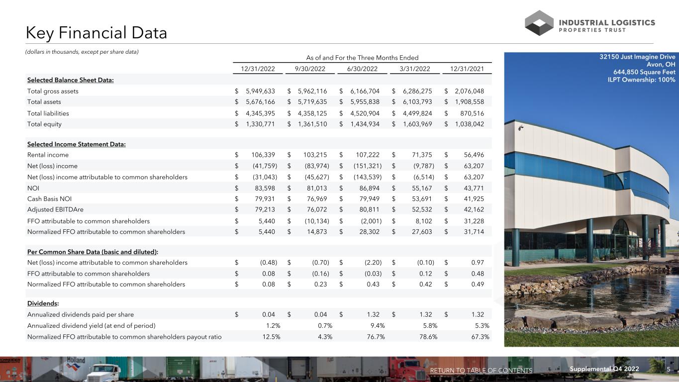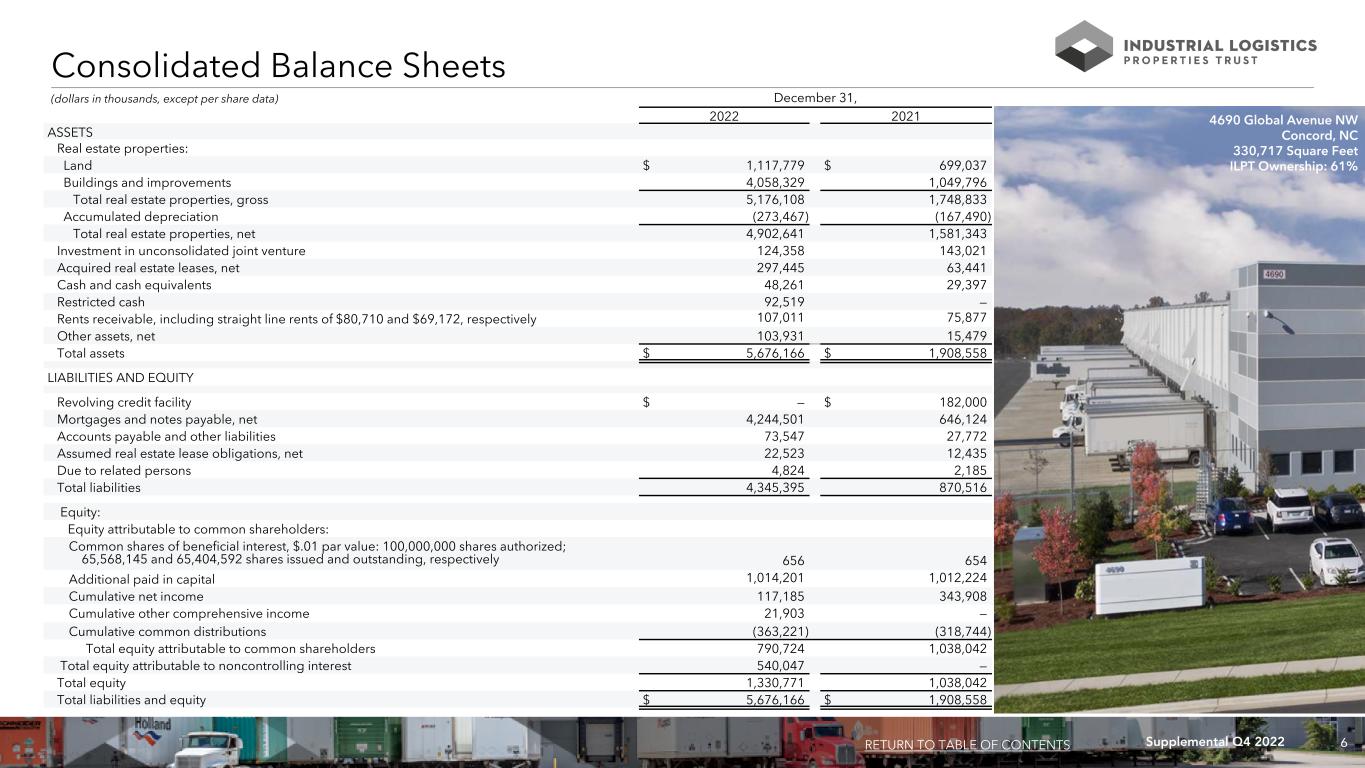5Supplemental Q4 2022 (dollars in thousands, except per share data) As of and For the Three Months Ended 12/31/2022 9/30/2022 6/30/2022 3/31/2022 12/31/2021 Selected Balance Sheet Data: Total gross assets $ 5,949,633 $ 5,962,116 $ 6,166,704 $ 6,286,275 $ 2,076,048 Total assets $ 5,676,166 $ 5,719,635 $ 5,955,838 $ 6,103,793 $ 1,908,558 Total liabilities $ 4,345,395 $ 4,358,125 $ 4,520,904 $ 4,499,824 $ 870,516 Total equity $ 1,330,771 $ 1,361,510 $ 1,434,934 $ 1,603,969 $ 1,038,042 Selected Income Statement Data: Rental income $ 106,339 $ 103,215 $ 107,222 $ 71,375 $ 56,496 Net (loss) income $ (41,759) $ (83,974) $ (151,321) $ (9,787) $ 63,207 Net (loss) income attributable to common shareholders $ (31,043) $ (45,627) $ (143,539) $ (6,514) $ 63,207 NOI $ 83,598 $ 81,013 $ 86,894 $ 55,167 $ 43,771 Cash Basis NOI $ 79,931 $ 76,969 $ 79,949 $ 53,691 $ 41,925 Adjusted EBITDAre $ 79,213 $ 76,072 $ 80,811 $ 52,532 $ 42,162 FFO attributable to common shareholders $ 5,440 $ (10,134) $ (2,001) $ 8,102 $ 31,228 Normalized FFO attributable to common shareholders $ 5,440 $ 14,873 $ 28,302 $ 27,603 $ 31,714 Per Common Share Data (basic and diluted): Net (loss) income attributable to common shareholders $ (0.48) $ (0.70) $ (2.20) $ (0.10) $ 0.97 FFO attributable to common shareholders $ 0.08 $ (0.16) $ (0.03) $ 0.12 $ 0.48 Normalized FFO attributable to common shareholders $ 0.08 $ 0.23 $ 0.43 $ 0.42 $ 0.49 Dividends: Annualized dividends paid per share $ 0.04 $ 0.04 $ 1.32 $ 1.32 $ 1.32 Annualized dividend yield (at end of period) 1.2% 0.7% 9.4% 5.8% 5.3% Normalized FFO attributable to common shareholders payout ratio 12.5% 4.3% 76.7% 78.6% 67.3% Key Financial Data RETURN TO TABLE OF CONTENTS 32150 Just Imagine Drive Avon, OH 644,850 Square Feet ILPT Ownership: 100%