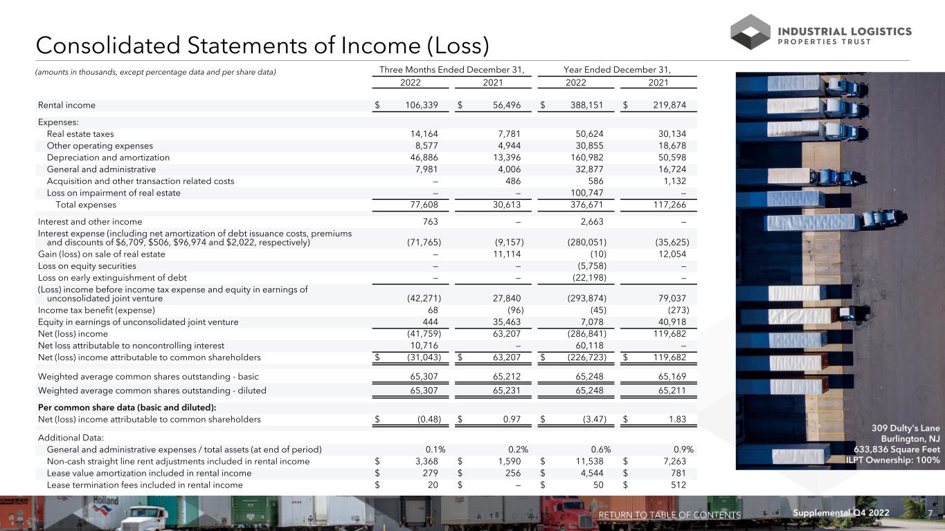 6Supplemental Q4 2022 Consolidated Balance Sheets December 31, 2022 2021 ASSETS Real estate properties: Land $ 1,117,779 $ 699,037 Buildings and improvements 4,058,329 1,049,796 Total real estate properties, gross 5,176,108 1,748,833 Accumulated depreciation (273,467) (167,490) Total real estate properties, net 4,902,641 1,581,343 Investment in unconsolidated joint venture 124,358 143,021 Acquired real estate leases, net 297,445 63,441 Cash and cash equivalents 48,261 29,397 Restricted cash 92,519 — Rents receivable, including straight line rents of $80,710 and $69,172, respectively 107,011 75,877 Other assets, net 103,931 15,479 Total assets $ 5,676,166 $ 1,908,558 LIABILITIES AND EQUITY Revolving credit facility $ — $ 182,000 Mortgages and notes payable, net 4,244,501 646,124 Accounts payable and other liabilities 73,547 27,772 Assumed real estate lease obligations, net 22,523 12,435 Due to related persons 4,824 2,185 Total liabilities 4,345,395 870,516 Equity: Equity attributable to common shareholders: Common shares of beneficial interest, $.01 par value: 100,000,000 shares authorized; 65,568,145 and 65,404,592 shares issued and outstanding, respectively 656 654 Additional paid in capital 1,014,201 1,012,224 Cumulative net income 117,185 343,908 Cumulative other comprehensive income 21,903 — Cumulative common distributions (363,221) (318,744) Total equity attributable to common shareholders 790,724 1,038,042 Total equity attributable to noncontrolling interest 540,047 — Total equity 1,330,771 1,038,042 Total liabilities and equity $ 5,676,166 $ 1,908,558 (dollars in thousands, except per share data) RETURN TO TABLE OF CONTENTS 4690 Global Avenue NW Concord, NC 330,717 Square Feet ILPT Ownership: 61%