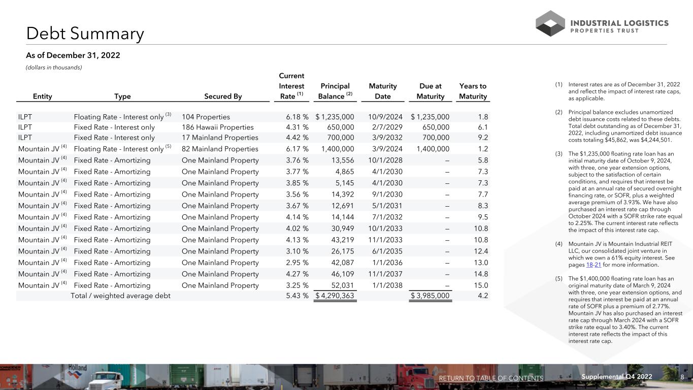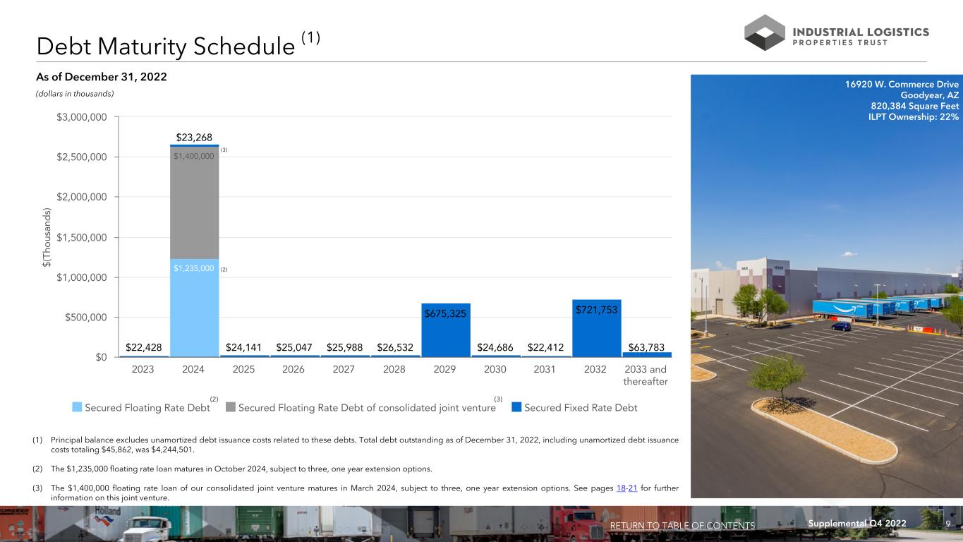 8Supplemental Q4 2022 (1) Interest rates are as of December 31, 2022 and reflect the impact of interest rate caps, as applicable. (2) Principal balance excludes unamortized debt issuance costs related to these debts. Total debt outstanding as of December 31, 2022, including unamortized debt issuance costs totaling $45,862, was $4,244,501. (3) The $1,235,000 floating rate loan has an initial maturity date of October 9, 2024, with three, one year extension options, subject to the satisfaction of certain conditions, and requires that interest be paid at an annual rate of secured overnight financing rate, or SOFR, plus a weighted average premium of 3.93%. We have also purchased an interest rate cap through October 2024 with a SOFR strike rate equal to 2.25%. The current interest rate reflects the impact of this interest rate cap. (4) Mountain JV is Mountain Industrial REIT LLC, our consolidated joint venture in which we own a 61% equity interest. See pages 18-21 for more information. (5) The $1,400,000 floating rate loan has an original maturity date of March 9, 2024 with three, one year extension options, and requires that interest be paid at an annual rate of SOFR plus a premium of 2.77%. Mountain JV has also purchased an interest rate cap through March 2024 with a SOFR strike rate equal to 3.40%. The current interest rate reflects the impact of this interest rate cap. Current Interest Principal Maturity Due at Years to Entity Type Secured By Rate (1) Balance (2) Date Maturity Maturity ILPT Floating Rate - Interest only (3) 104 Properties 6.18 % $ 1,235,000 10/9/2024 $ 1,235,000 1.8 ILPT Fixed Rate - Interest only 186 Hawaii Properties 4.31 % 650,000 2/7/2029 650,000 6.1 ILPT Fixed Rate - Interest only 17 Mainland Properties 4.42 % 700,000 3/9/2032 700,000 9.2 Mountain JV (4) Floating Rate - Interest only (5) 82 Mainland Properties 6.17 % 1,400,000 3/9/2024 1,400,000 1.2 Mountain JV (4) Fixed Rate - Amortizing One Mainland Property 3.76 % 13,556 10/1/2028 — 5.8 Mountain JV (4) Fixed Rate - Amortizing One Mainland Property 3.77 % 4,865 4/1/2030 — 7.3 Mountain JV (4) Fixed Rate - Amortizing One Mainland Property 3.85 % 5,145 4/1/2030 — 7.3 Mountain JV (4) Fixed Rate - Amortizing One Mainland Property 3.56 % 14,392 9/1/2030 — 7.7 Mountain JV (4) Fixed Rate - Amortizing One Mainland Property 3.67 % 12,691 5/1/2031 — 8.3 Mountain JV (4) Fixed Rate - Amortizing One Mainland Property 4.14 % 14,144 7/1/2032 — 9.5 Mountain JV (4) Fixed Rate - Amortizing One Mainland Property 4.02 % 30,949 10/1/2033 — 10.8 Mountain JV (4) Fixed Rate - Amortizing One Mainland Property 4.13 % 43,219 11/1/2033 — 10.8 Mountain JV (4) Fixed Rate - Amortizing One Mainland Property 3.10 % 26,175 6/1/2035 — 12.4 Mountain JV (4) Fixed Rate - Amortizing One Mainland Property 2.95 % 42,087 1/1/2036 — 13.0 Mountain JV (4) Fixed Rate - Amortizing One Mainland Property 4.27 % 46,109 11/1/2037 — 14.8 Mountain JV (4) Fixed Rate - Amortizing One Mainland Property 3.25 % 52,031 1/1/2038 — 15.0 Total / weighted average debt 5.43 % $ 4,290,363 $ 3,985,000 4.2 Debt Summary RETURN TO TABLE OF CONTENTS (dollars in thousands) As of December 31, 2022