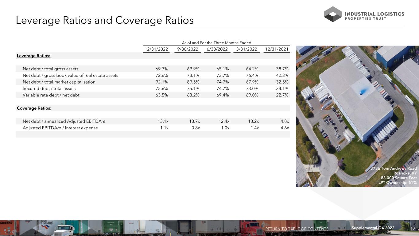 9Supplemental Q4 2022 (1) Principal balance excludes unamortized debt issuance costs related to these debts. Total debt outstanding as of December 31, 2022, including unamortized debt issuance costs totaling $45,862, was $4,244,501. (2) The $1,235,000 floating rate loan matures in October 2024, subject to three, one year extension options. (3) The $1,400,000 floating rate loan of our consolidated joint venture matures in March 2024, subject to three, one year extension options. See pages 18-21 for further information on this joint venture. Debt Maturity Schedule (1) RETURN TO TABLE OF CONTENTS (dollars in thousands) As of December 31, 2022 $( Th ou sa nd s) $1,235,000 $1,400,000 $22,428 $23,268 $24,141 $25,047 $25,988 $26,532 $675,325 $24,686 $22,412 $721,753 $63,783 Secured Floating Rate Debt Secured Floating Rate Debt of consolidated joint venture Secured Fixed Rate Debt 2023 2024 2025 2026 2027 2028 2029 2030 2031 2032 2033 and thereafter $0 $500,000 $1,000,000 $1,500,000 $2,000,000 $2,500,000 $3,000,000 (3) (3) 16920 W. Commerce Drive Goodyear, AZ 820,384 Square Feet ILPT Ownership: 22% (2) (2)