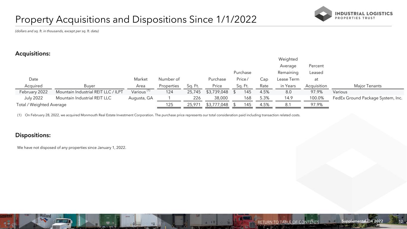 11Supplemental Q4 2022 (dollars in thousands) For the Three Months Ended 12/31/2022 9/30/2022 6/30/2022 3/31/2022 12/31/2021 Tenant improvements and leasing costs $ 4,369 $ 2,302 $ 2,627 $ 3,361 $ 2,736 Building improvements 2,221 1,292 376 110 1,315 Recurring capital expenditures 6,590 3,594 3,003 3,471 4,051 Development, redevelopment and other activities 1,322 4,980 7,077 294 556 Total capital expenditures $ 7,912 $ 8,574 $ 10,080 $ 3,765 $ 4,607 Capital Expenditures Summary RETURN TO TABLE OF CONTENTS 2020 Joe B. Jackson Parkway Murfreesboro, TN 1,016,281 Square Feet ILPT Ownership: 100%