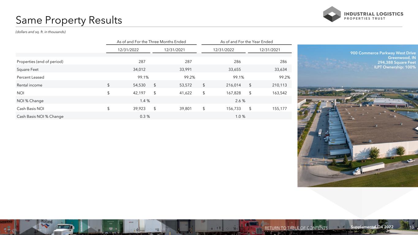 12Supplemental Q4 2022 Property Acquisitions and Dispositions Since 1/1/2022 (dollars and sq. ft. in thousands, except per sq. ft. data) Dispositions: Weighted Average Percent Purchase Remaining Leased Date Market Number of Purchase Price / Cap Lease Term at Acquired Buyer Area Properties Sq. Ft. Price Sq. Ft. Rate in Years Acquisition Major Tenants February 2022 Mountain Industrial REIT LLC / ILPT Various (1) 124 25,745 $ 3,739,048 $ 145 4.5% 8.0 97.9% Various July 2022 Mountain Industrial REIT LLC Augusta, GA 1 226 38,000 168 5.3% 14.9 100.0% FedEx Ground Package System, Inc. Total / Weighted Average 125 25,971 $ 3,777,048 $ 145 4.5% 8.1 97.9% RETURN TO TABLE OF CONTENTS We have not disposed of any properties since January 1, 2022. (1) On February 28, 2022, we acquired Monmouth Real Estate Investment Corporation. The purchase price represents our total consideration paid including transaction related costs. Acquisitions: