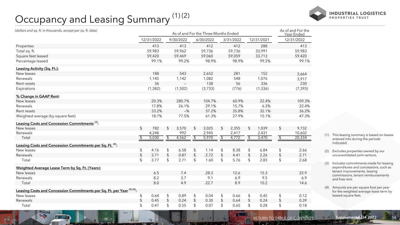 13Supplemental Q4 2022 (dollars and sq. ft. in thousands) As of and For the Three Months Ended As of and For the Year Ended 12/31/2022 12/31/2021 12/31/2022 12/31/2021 Properties (end of period) 287 287 286 286 Square Feet 34,012 33,991 33,655 33,634 Percent Leased 99.1% 99.2% 99.1% 99.2% Rental income $ 54,530 $ 53,572 $ 216,014 $ 210,113 NOI $ 42,197 $ 41,622 $ 167,828 $ 163,542 NOI % Change 1.4 % 2.6 % Cash Basis NOI $ 39,923 $ 39,801 $ 156,733 $ 155,177 Cash Basis NOI % Change 0.3 % 1.0 % Same Property Results RETURN TO TABLE OF CONTENTS 900 Commerce Parkway West Drive Greenwood, IN 294,388 Square Feet ILPT Ownership: 100%