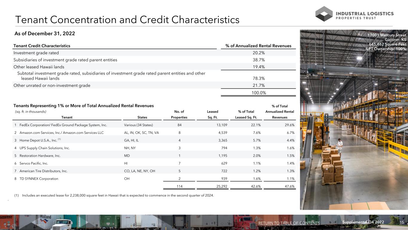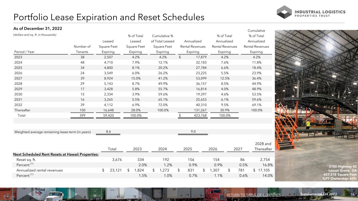 15Supplemental Q4 2022 As of December 31, 2022 Tenant Credit Characteristics % of Annualized Rental Revenues Investment grade rated 20.2% Subsidiaries of investment grade rated parent entities 38.7% Other leased Hawaii lands 19.4% Subtotal investment grade rated, subsidiaries of investment grade rated parent entities and other leased Hawaii lands 78.3% Other unrated or non-investment grade 21.7% 100.0% Tenant Concentration and Credit Characteristics RETURN TO TABLE OF CONTENTS 17001 Mercury Street Gardner, KS 645,462 Square Feet ILPT Ownership: 100% Tenants Representing 1% or More of Total Annualized Rental Revenues % of Total No. of Leased % of Total Annualized Rental Tenant States Properties Sq. Ft. Leased Sq. Ft. Revenues 1 FedEx Corporation/ FedEx Ground Package System, Inc. Various (34 States) 84 13,109 22.1% 29.6% 2 Amazon.com Services, Inc./ Amazon.com Services LLC AL, IN, OK, SC, TN, VA 8 4,539 7.6% 6.7% 3 Home Depot U.S.A., Inc. (1) GA, HI, IL 4 3,365 5.7% 4.4% 4 UPS Supply Chain Solutions, Inc. NH, NY 3 794 1.3% 1.6% 5 Restoration Hardware, Inc. MD 1 1,195 2.0% 1.5% 6 Servco Pacific, Inc. HI 7 629 1.1% 1.4% 7 American Tire Distributors, Inc. CO, LA, NE, NY, OH 5 722 1.2% 1.3% 8 TD SYNNEX Corporation OH 2 939 1.6% 1.1% 114 25,292 42.6% 47.6% (1) Includes an executed lease for 2,238,000 square feet in Hawaii that is expected to commence in the second quarter of 2024. . (sq. ft. in thousands)