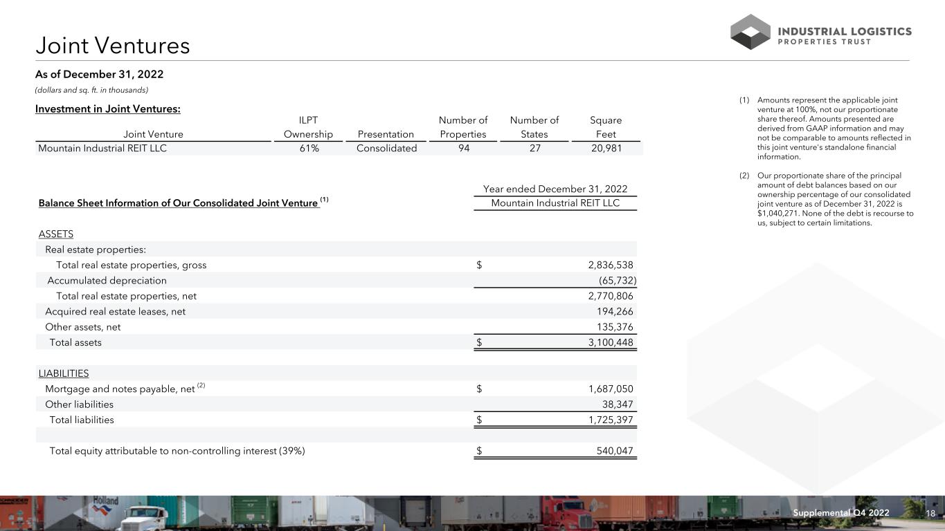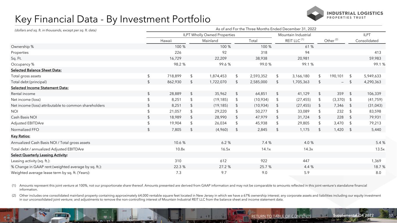 17Supplemental Q4 2022 (dollars and sq. ft. in thousands, except per sq. ft. data) Key Financial Data - By Investment Portfolio RETURN TO TABLE OF CONTENTS As of and For the Three Months Ended December 31, 2022 ILPT Wholly Owned Properties Mountain Industrial ILPT Hawaii Mainland Total REIT LLC (1) Other (2) Consolidated Ownership % 100 % 100 % 100 % 61 % Properties 226 92 318 94 413 Sq. Ft. 16,729 22,209 38,938 20,981 59,983 Occupancy % 98.2 % 99.6 % 99.0 % 99.1 % 99.1 % Selected Balance Sheet Data: Total gross assets $ 718,899 $ 1,874,453 $ 2,593,352 $ 3,166,180 $ 190,101 $ 5,949,633 Total debt (principal) $ 862,930 $ 1,722,070 $ 2,585,000 $ 1,705,363 $ — $ 4,290,363 Selected Income Statement Data: Rental income $ 28,889 $ 35,962 $ 64,851 $ 41,129 $ 359 $ 106,339 Net income (loss) $ 8,251 $ (19,185) $ (10,934) $ (27,455) $ (3,370) $ (41,759) Net income (loss) attributable to common shareholders $ 8,251 $ (19,185) $ (10,934) $ (27,455) $ 7,346 $ (31,043) NOI $ 21,057 $ 29,220 $ 50,277 $ 33,089 $ 232 $ 83,598 Cash Basis NOI $ 18,989 $ 28,990 $ 47,979 $ 31,724 $ 228 $ 79,931 Adjusted EBITDAre $ 19,904 $ 26,034 $ 45,938 $ 29,805 $ 3,470 $ 79,213 Normalized FFO $ 7,805 $ (4,960) $ 2,845 $ 1,175 $ 1,420 $ 5,440 Key Ratios: Annualized Cash Basis NOI / Total gross assets 10.6 % 6.2 % 7.4 % 4.0 % 5.4 % Total debt / annualized Adjusted EBITDAre 10.8x 16.5x 14.1x 14.3x 13.5x Select Quarterly Leasing Activity: Leasing activity (sq. ft.): 310 612 922 447 1,369 % Change in GAAP rent (weighted average by sq. ft.): 22.3 % 27.2 % 25.7 % 4.4 % 18.7 % Weighted average lease term by sq. ft. (Years): 7.3 9.7 9.0 5.9 8.0 (1) Amounts represent this joint venture at 100%, not our proportionate share thereof. Amounts presented are derived from GAAP information and may not be comparable to amounts reflected in this joint venture's standalone financial information. (2) Other includes one consolidated mainland property containing approximately 64,000 rentable square feet located in New Jersey in which we have a 67% ownership interest; any corporate assets and liabilities including our equity investment in our unconsolidated joint venture; and adjustments to remove the non-controlling interest of Mountain Industrial REIT LLC from the balance sheet and income statement data.