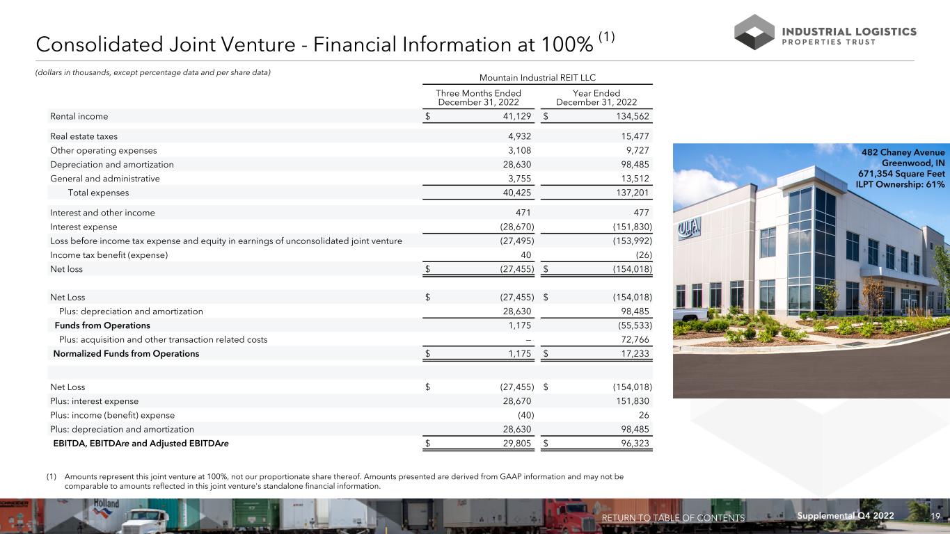 18Supplemental Q4 2022 Joint Ventures (dollars and sq. ft. in thousands) Investment in Joint Ventures: ILPT Number of Number of Square Joint Venture Ownership Presentation Properties States Feet Mountain Industrial REIT LLC 61% Consolidated 94 27 20,981 (1) Amounts represent the applicable joint venture at 100%, not our proportionate share thereof. Amounts presented are derived from GAAP information and may not be comparable to amounts reflected in this joint venture's standalone financial information. (2) Our proportionate share of the principal amount of debt balances based on our ownership percentage of our consolidated joint venture as of December 31, 2022 is $1,040,271. None of the debt is recourse to us, subject to certain limitations. As of December 31, 2022 Year ended December 31, 2022 Balance Sheet Information of Our Consolidated Joint Venture (1) Mountain Industrial REIT LLC ASSETS Real estate properties: Total real estate properties, gross $ 2,836,538 Accumulated depreciation (65,732) Total real estate properties, net 2,770,806 Acquired real estate leases, net 194,266 Other assets, net 135,376 Total assets $ 3,100,448 LIABILITIES Mortgage and notes payable, net (2) $ 1,687,050 Other liabilities 38,347 Total liabilities $ 1,725,397 Total equity attributable to non-controlling interest (39%) $ 540,047
