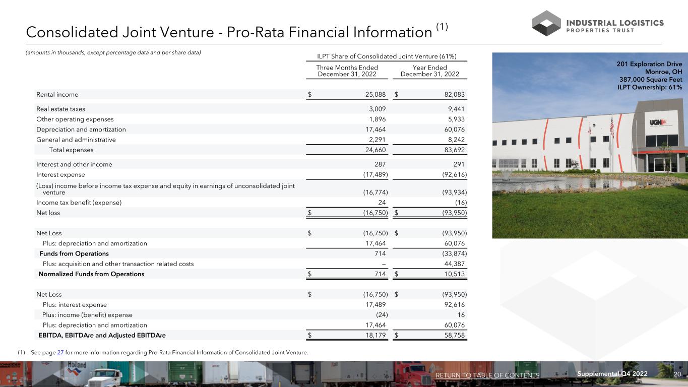 19Supplemental Q4 2022 Consolidated Joint Venture - Financial Information at 100% (1) RETURN TO TABLE OF CONTENTS Mountain Industrial REIT LLC Three Months Ended December 31, 2022 Year Ended December 31, 2022 Rental income $ 41,129 $ 134,562 Real estate taxes 4,932 15,477 Other operating expenses 3,108 9,727 Depreciation and amortization 28,630 98,485 General and administrative 3,755 13,512 Total expenses 40,425 137,201 Interest and other income 471 477 Interest expense (28,670) (151,830) Loss before income tax expense and equity in earnings of unconsolidated joint venture (27,495) (153,992) Income tax benefit (expense) 40 (26) Net loss $ (27,455) $ (154,018) Net Loss $ (27,455) $ (154,018) Plus: depreciation and amortization 28,630 98,485 Funds from Operations 1,175 (55,533) Plus: acquisition and other transaction related costs — 72,766 Normalized Funds from Operations $ 1,175 $ 17,233 Net Loss $ (27,455) $ (154,018) Plus: interest expense 28,670 151,830 Plus: income (benefit) expense (40) 26 Plus: depreciation and amortization 28,630 98,485 EBITDA, EBITDAre and Adjusted EBITDAre $ 29,805 $ 96,323 (dollars in thousands, except percentage data and per share data) (1) Amounts represent this joint venture at 100%, not our proportionate share thereof. Amounts presented are derived from GAAP information and may not be comparable to amounts reflected in this joint venture's standalone financial information. 482 Chaney Avenue Greenwood, IN 671,354 Square Feet ILPT Ownership: 61%