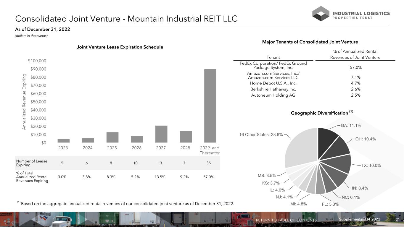 21Supplemental Q4 2022 GA: 11.1% OH: 10.4% TX: 10.0% IN: 8.4% NC: 6.1% FL: 5.3%MI: 4.8% NJ: 4.1% IL: 4.0% KS: 3.7% MS: 3.5% 16 Other States: 28.6% Consolidated Joint Venture - Mountain Industrial REIT LLC (dollars in thousands) Number of Leases Expiring 5 6 8 10 13 7 35 % of Total Annualized Rental Revenues Expiring 3.0% 3.8% 8.3% 5.2% 13.5% 9.2% 57.0% A nn ua liz ed R ev en ue E xp ir in g 2023 2024 2025 2026 2027 2028 2029 and Thereafter $0 $10,000 $20,000 $30,000 $40,000 $50,000 $60,000 $70,000 $80,000 $90,000 $100,000 Joint Venture Lease Expiration Schedule As of December 31, 2022 RETURN TO TABLE OF CONTENTS Major Tenants of Consolidated Joint Venture % of Annualized Rental Tenant Revenues of Joint Venture FedEx Corporation/ FedEx Ground Package System, Inc. 57.0% Amazon.com Services, Inc./ Amazon.com Services LLC 7.1% Home Depot U.S.A., Inc. 4.7% Berkshire Hathaway Inc. 2.6% Autoneum Holding AG 2.5% Geographic Diversification (1) (1) Based on the aggregate annualized rental revenues of our consolidated joint venture as of December 31, 2022.