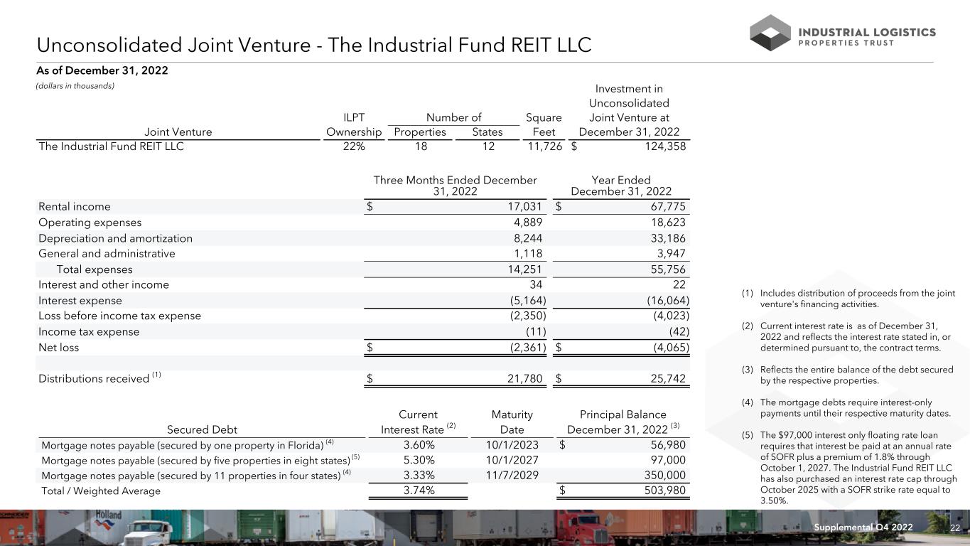 22Supplemental Q4 2022 Unconsolidated Joint Venture - The Industrial Fund REIT LLC (dollars in thousands) As of December 31, 2022 Investment in Unconsolidated ILPT Number of Square Joint Venture at Joint Venture Ownership Properties States Feet December 31, 2022 The Industrial Fund REIT LLC 22% 18 12 11,726 $ 124,358 Three Months Ended December 31, 2022 Year Ended December 31, 2022 Rental income $ 17,031 $ 67,775 Operating expenses 4,889 18,623 Depreciation and amortization 8,244 33,186 General and administrative 1,118 3,947 Total expenses 14,251 55,756 Interest and other income 34 22 Interest expense (5,164) (16,064) Loss before income tax expense (2,350) (4,023) Income tax expense (11) (42) Net loss $ (2,361) $ (4,065) Distributions received (1) $ 21,780 $ 25,742 Current Maturity Principal Balance Secured Debt Interest Rate (2) Date December 31, 2022 (3) Mortgage notes payable (secured by one property in Florida) (4) 3.60% 10/1/2023 $ 56,980 Mortgage notes payable (secured by five properties in eight states) (5) 5.30% 10/1/2027 97,000 Mortgage notes payable (secured by 11 properties in four states) (4) 3.33% 11/7/2029 350,000 Total / Weighted Average 3.74% $ 503,980 (1) Includes distribution of proceeds from the joint venture's financing activities. (2) Current interest rate is as of December 31, 2022 and reflects the interest rate stated in, or determined pursuant to, the contract terms. (3) Reflects the entire balance of the debt secured by the respective properties. (4) The mortgage debts require interest-only payments until their respective maturity dates. (5) The $97,000 interest only floating rate loan requires that interest be paid at an annual rate of SOFR plus a premium of 1.8% through October 1, 2027. The Industrial Fund REIT LLC has also purchased an interest rate cap through October 2025 with a SOFR strike rate equal to 3.50%.