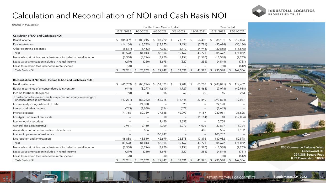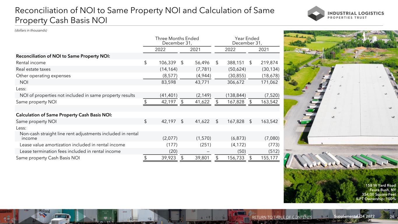 23Supplemental Q4 2022 Calculation and Reconciliation of NOI and Cash Basis NOI (dollars in thousands) For the Three Months Ended Year Ended 12/31/2022 9/30/2022 6/30/2022 3/31/2022 12/31/2021 12/31/2022 12/31/2021 Calculation of NOI and Cash Basis NOI: Rental income $ 106,339 $ 103,215 $ 107,222 $ 71,375 $ 56,496 $ 388,151 $ 219,874 Real estate taxes (14,164) (13,749) (13,275) (9,436) (7,781) (50,624) (30,134) Other operating expenses (8,577) (8,453) (7,053) (6,772) (4,944) (30,855) (18,678) NOI 83,598 81,013 86,894 55,167 43,771 306,672 171,062 Non-cash straight line rent adjustments included in rental income (3,368) (3,794) (3,220) (1,156) (1,590) (11,538) (7,263) Lease value amortization included in rental income (279) (250) (3,695) (320) (256) (4,544) (781) Lease termination fees included in rental income (20) — (30) — — (50) (512) Cash Basis NOI $ 79,931 $ 76,969 $ 79,949 $ 53,691 $ 41,925 $ 290,540 $ 162,506 Reconciliation of Net (Loss) Income to NOI and Cash Basis NOI: Net (loss) income $ (41,759) $ (83,974) $ (151,321) $ (9,787) $ 63,207 $ (286,841) $ 119,682 Equity in earnings of unconsolidated joint venture (444) (3,297) (1,610) (1,727) (35,463) (7,078) (40,918) Income tax (benefit) expense (68) 28 16 69 96 45 273 (Loss) income before income tax expense and equity in earnings of unconsolidated joint venture (42,271) (87,243) (152,915) (11,445) 27,840 (293,874) 79,037 Loss on early extinguishment of debt — 21,370 — 828 — 22,198 — Interest and other income (763) (1,068) (354) (478) — (2,663) — Interest expense 71,765 89,739 77,548 40,999 9,157 280,051 35,625 Loss (gain) on sale of real estate — — 10 — (11,114) 10 (12,054) Loss on equity securities — — 9,450 (3,692) — 5,758 — General and administrative 7,981 9,110 9,709 6,077 4,006 32,877 16,724 Acquisition and other transaction related costs — 586 — — 486 586 1,132 Loss on impairment of real estate — — 100,747 — — 100,747 — Depreciation and amortization 46,886 48,519 42,699 22,878 13,396 160,982 50,598 NOI 83,598 81,013 86,894 55,167 43,771 306,672 171,062 Non-cash straight line rent adjustments included in rental income (3,368) (3,794) (3,220) (1,156) (1,590) (11,538) (7,263) Lease value amortization included in rental income (279) (250) (3,695) (320) (256) (4,544) (781) Lease termination fees included in rental income (20) — (30) — — (50) (512) Cash Basis NOI $ 79,931 $ 76,969 $ 79,949 $ 53,691 $ 41,925 $ 290,540 $ 162,506 RETURN TO TABLE OF CONTENTS 900 Commerce Parkway West Greenwood, IN 294,388 Square Feet ILPT Ownership: 100%