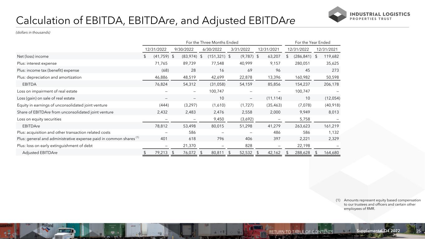 24Supplemental Q4 2022 Reconciliation of NOI to Same Property NOI and Calculation of Same Property Cash Basis NOI (dollars in thousands) Three Months Ended December 31, Year Ended December 31, 2022 2021 2022 2021 Reconciliation of NOI to Same Property NOI: Rental income $ 106,339 $ 56,496 $ 388,151 $ 219,874 Real estate taxes (14,164) (7,781) (50,624) (30,134) Other operating expenses (8,577) (4,944) (30,855) (18,678) NOI 83,598 43,771 306,672 171,062 Less: NOI of properties not included in same property results (41,401) (2,149) (138,844) (7,520) Same property NOI $ 42,197 $ 41,622 $ 167,828 $ 163,542 Calculation of Same Property Cash Basis NOI: Same property NOI $ 42,197 $ 41,622 $ 167,828 $ 163,542 Less: Non-cash straight line rent adjustments included in rental income (2,077) (1,570) (6,873) (7,080) Lease value amortization included in rental income (177) (251) (4,172) (773) Lease termination fees included in rental income (20) — (50) (512) Same property Cash Basis NOI $ 39,923 $ 39,801 $ 156,733 $ 155,177 RETURN TO TABLE OF CONTENTS 158 W Yard Road Feura Bush, NY 354,00 Square Feet ILPT Ownership: 100%