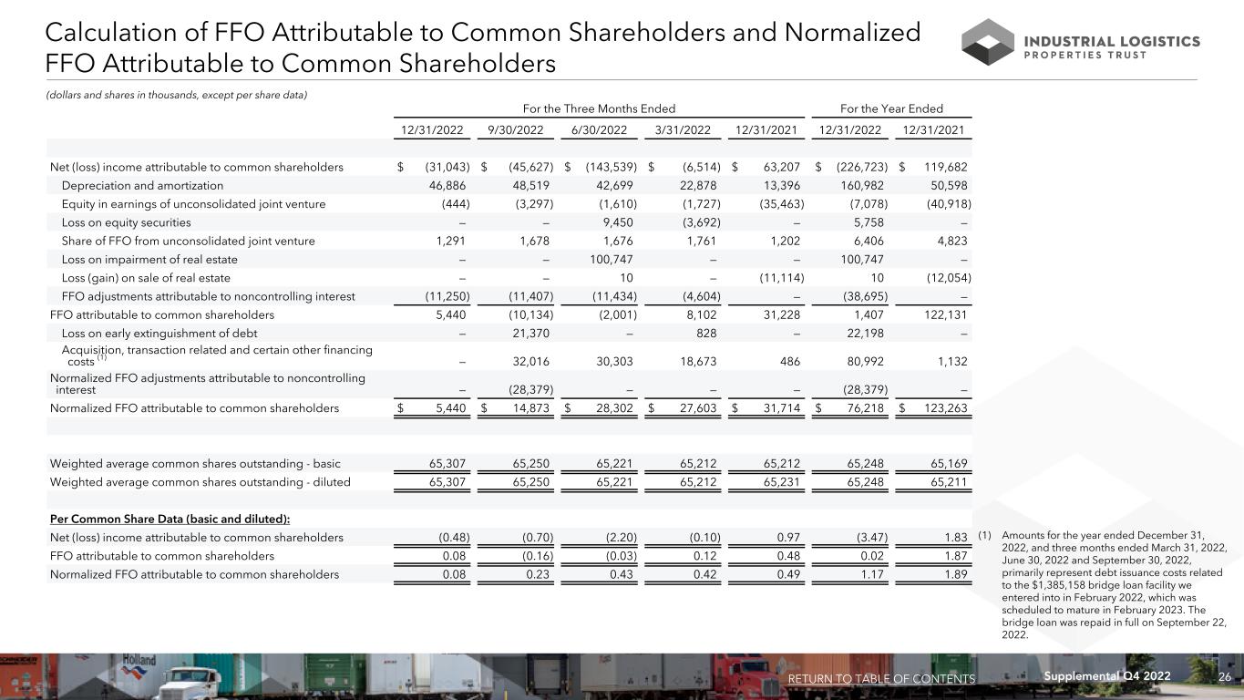 25Supplemental Q4 2022 Calculation of EBITDA, EBITDAre, and Adjusted EBITDAre (dollars in thousands) For the Three Months Ended For the Year Ended 12/31/2022 9/30/2022 6/30/2022 3/31/2022 12/31/2021 12/31/2022 12/31/2021 Net (loss) income $ (41,759) $ (83,974) $ (151,321) $ (9,787) $ 63,207 $ (286,841) $ 119,682 Plus: interest expense 71,765 89,739 77,548 40,999 9,157 280,051 35,625 Plus: income tax (benefit) expense (68) 28 16 69 96 45 273 Plus: depreciation and amortization 46,886 48,519 42,699 22,878 13,396 160,982 50,598 EBITDA 76,824 54,312 (31,058) 54,159 85,856 154,237 206,178 Loss on impairment of real estate — — 100,747 — — 100,747 — Loss (gain) on sale of real estate — — 10 — (11,114) 10 (12,054) Equity in earnings of unconsolidated joint venture (444) (3,297) (1,610) (1,727) (35,463) (7,078) (40,918) Share of EBITDAre from unconsolidated joint venture 2,432 2,483 2,476 2,558 2,000 9,949 8,013 Loss on equity securities — — 9,450 (3,692) — 5,758 — EBITDAre 78,812 53,498 80,015 51,298 41,279 263,623 161,219 Plus: acquisition and other transaction related costs — 586 — — 486 586 1,132 Plus: general and administrative expense paid in common shares (1) 401 618 796 406 397 2,221 2,329 Plus: loss on early extinguishment of debt — 21,370 — 828 — 22,198 — Adjusted EBITDAre $ 79,213 $ 76,072 $ 80,811 $ 52,532 $ 42,162 $ 288,628 $ 164,680 (1) Amounts represent equity based compensation to our trustees and officers and certain other employees of RMR. RETURN TO TABLE OF CONTENTS