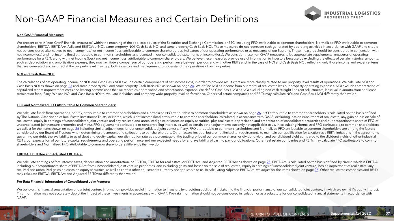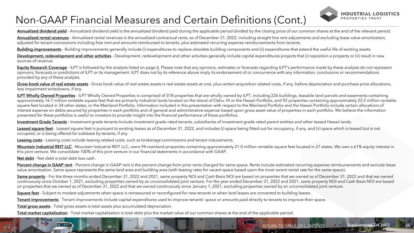 27Supplemental Q4 2022 FFO and Normalized FFO Attributable to Common Shareholders: We calculate funds from operations, or FFO, attributable to common shareholders and Normalized FFO attributable to common shareholders as shown on page 26. FFO attributable to common shareholders is calculated on the basis defined by The National Association of Real Estate Investment Trusts, or Nareit, which is net income (loss) attributable to common shareholders, calculated in accordance with GAAP, excluding loss on impairment of real estate, any gain or loss on sale of real estate, equity in earnings of unconsolidated joint venture and any realized and unrealized gains or losses on equity securities, plus real estate depreciation and amortization of consolidated properties and our proportionate share of FFO of unconsolidated joint venture properties and minus FFO adjustments attributable to noncontrolling interest, as well as certain other adjustments currently not applicable to us. In calculating Normalized FFO attributable to common shareholders, we adjust for the items shown on page 26 including similar adjustments for our unconsolidated joint venture, if any. FFO attributable to common shareholders and Normalized FFO attributable to common shareholders are among the factors considered by our Board of Trustees when determining the amount of distributions to our shareholders. Other factors include, but are not limited to, requirements to maintain our qualification for taxation as a REIT, limitations in the agreements governing our debt, the availability to us of debt and equity capital, our distribution rate as a percentage of the trading price of our common shares, or dividend yield, and our dividend yield compared to the dividend yields of other industrial REITs, our expectation of our future capital requirements and operating performance and our expected needs for and availability of cash to pay our obligations. Other real estate companies and REITs may calculate FFO attributable to common shareholders and Normalized FFO attributable to common shareholders differently than we do. Non-GAAP Financial Measures: We present certain “non-GAAP financial measures” within the meaning of the applicable rules of the Securities and Exchange Commission, or SEC, including FFO attributable to common shareholders, Normalized FFO attributable to common shareholders, EBITDA, EBITDAre, Adjusted EBITDAre, NOI, same property NOI, Cash Basis NOI and same property Cash Basis NOI. These measures do not represent cash generated by operating activities in accordance with GAAP and should not be considered alternatives to net income (loss) or net income (loss) attributable to common shareholders as indicators of our operating performance or as measures of our liquidity. These measures should be considered in conjunction with net income (loss) and net income (loss) attributable to common shareholders as presented in our consolidated statements of income (loss). We consider these non-GAAP measures to be appropriate supplemental measures of operating performance for a REIT, along with net income (loss) and net income (loss) attributable to common shareholders. We believe these measures provide useful information to investors because by excluding the effects of certain historical amounts, such as depreciation and amortization expense, they may facilitate a comparison of our operating performance between periods and with other REITs and, in the case of NOI and Cash Basis NOI, reflecting only those income and expense items that are generated and incurred at the property level may help both investors and management to understand the operations of our properties. NOI and Cash Basis NOI: The calculations of net operating income, or NOI, and Cash Basis NOI exclude certain components of net income (loss) in order to provide results that are more closely related to our property level results of operations. We calculate NOI and Cash Basis NOI as shown on page 23 and same property NOI and same property Cash Basis NOI as shown on page 24. We define NOI as income from our rental of real estate less our property operating expenses. NOI excludes amortization of capitalized tenant improvement costs and leasing commissions that we record as depreciation and amortization expense. We define Cash Basis NOI as NOI excluding non-cash straight line rent adjustments, lease value amortization and lease termination fees, if any. We use NOI and Cash Basis NOI to evaluate individual and company-wide property level performance. Other real estate companies and REITs may calculate NOI and Cash Basis NOI differently than we do. Non-GAAP Financial Measures and Certain Definitions EBITDA, EBITDAre and Adjusted EBITDAre: We calculate earnings before interest, taxes, depreciation and amortization, or EBITDA, EBITDA for real estate, or EBITDAre, and Adjusted EBITDAre as shown on page 25. EBITDAre is calculated on the basis defined by Nareit, which is EBITDA, including our proportionate share of EBITDAre from unconsolidated joint venture properties, and excluding gains and losses on the sale of real estate, equity in earnings of unconsolidated joint venture, loss on impairment of real estate, any realized and unrealized gains or losses on equity securities, as well as certain other adjustments currently not applicable to us. In calculating Adjusted EBITDAre, we adjust for the items shown on page 25. Other real estate companies and REITs may calculate EBITDA, EBITDAre and Adjusted EBITDAre differently than we do. Pro-Rata Financial Information of Consolidated Joint Venture: We believe this financial presentation of our joint venture information provides useful information to investors by providing additional insight into the financial performance of our consolidated joint venture, in which we own 61% equity interest. This information may not accurately depict the impact of these investments in accordance with GAAP. Pro-rata information should not be considered in