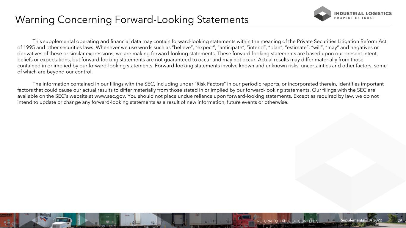 28Supplemental Q4 2022 Non-GAAP Financial Measures and Certain Definitions (Cont.) Annualized dividend yield - Annualized dividend yield is the annualized dividend paid during the applicable period divided by the closing price of our common shares at the end of the relevant period. Annualized rental revenues - Annualized rental revenues is the annualized contractual rents, as of December 31, 2022, including straight line rent adjustments and excluding lease value amortization, adjusted for tenant concessions including free rent and amounts reimbursed to tenants, plus estimated recurring expense reimbursements from tenants. Building improvements - Building improvements generally include (i) expenditures to replace obsolete building components and (ii) expenditures that extend the useful life of existing assets. Development, redevelopment and other activities - Development, redevelopment and other activities generally include capital expenditures projects that (i) reposition a property or (ii) result in new sources of revenue. Equity Research Coverage - ILPT is followed by the analysts listed on page 4. Please note that any opinions, estimates or forecasts regarding ILPT’s performance made by these analysts do not represent opinions, forecasts or predictions of ILPT or its management. ILPT does not by its reference above imply its endorsement of or concurrence with any information, conclusions or recommendations provided by any of these analysts. Gross book value of real estate assets - Gross book value of real estate assets is real estate assets at cost, plus certain acquisition related costs, if any, before depreciation and purchase price allocations, less impairment writedowns, if any. ILPT Wholly Owned Properties - ILPT Wholly Owned Properties is comprised of 318 properties that are wholly owned by ILPT, including 226 buildings, leasable land parcels and easements containing approximately 16.7 million rentable square feet that are primarily industrial lands located on the island of Oahu, HI or the Hawaii Portfolio, and 92 properties containing approximately 22.2 million rentable square feet located in 34 other states, or the Mainland Portfolio. Information included in this presentation with respect to the Mainland Portfolio and the Hawaii Portfolio include certain allocations of interest expense on debts secured by properties in each portfolio and of general and administrative expense based upon gross asset value of properties in each portfolio. We believe the information presented for these portfolios is useful to investors to provide insight into the financial performance of these portfolios. Investment Grade Tenants - Investment grade tenants Include investment grade rated tenants, subsidiaries of investment grade rated parent entities and other leased Hawaii lands. Leased square feet - Leased square feet is pursuant to existing leases as of December 31, 2022, and includes (i) space being fitted out for occupancy, if any, and (ii) space which is leased but is not occupied, or is being offered for sublease by tenants, if any. Leasing costs - Leasing costs include leasing related costs, such as brokerage commissions and tenant inducements. Mountain Industrial REIT LLC - Mountain Industrial REIT LLC, owns 94 mainland properties containing approximately 21.0 million rentable square feet located in 27 states. We own a 61% equity interest in this joint venture. We consolidate 100% of this joint venture in our financial statements in accordance with GAAP. Net debt - Net debt is total debt less cash. Percent change in GAAP rent - Percent change in GAAP rent is the percent change from prior rents charged for same space. Rents include estimated recurring expense reimbursements and exclude lease value amortization. Same space represents the same land area and building area (with leasing rates for vacant space based upon the most recent rental rate for the same space). Same property - For the three months ended December 31, 2022 and 2021, same property NOI and Cash Basis NOI are based on properties that we owned as of December 31, 2022 and that we owned continuously since October 1, 2021, excluding properties owned by an unconsolidated joint venture. For the year ended December 31, 2022 and 2021, same property NOI and Cash Basis NOI are based on properties that we owned as of December 31, 2022 and that we owned continuously since January 1, 2021, excluding properties owned by an unconsolidated joint venture. Square feet - Subject to modest adjustments when space is remeasured or reconfigured for new tenants or when land leases are converted to building leases. Tenant improvements - Tenant improvements include capital expenditures used to improve tenants' space or amounts paid directly to tenants to improve their space. Total gross assets - Total gross assets is total assets plus accumulated depreciation. Total market capitalization - Total market capitalization is total debt plus the market value of our common shares at the end of the applicable period. RETURN TO TABLE OF CONTENTS
