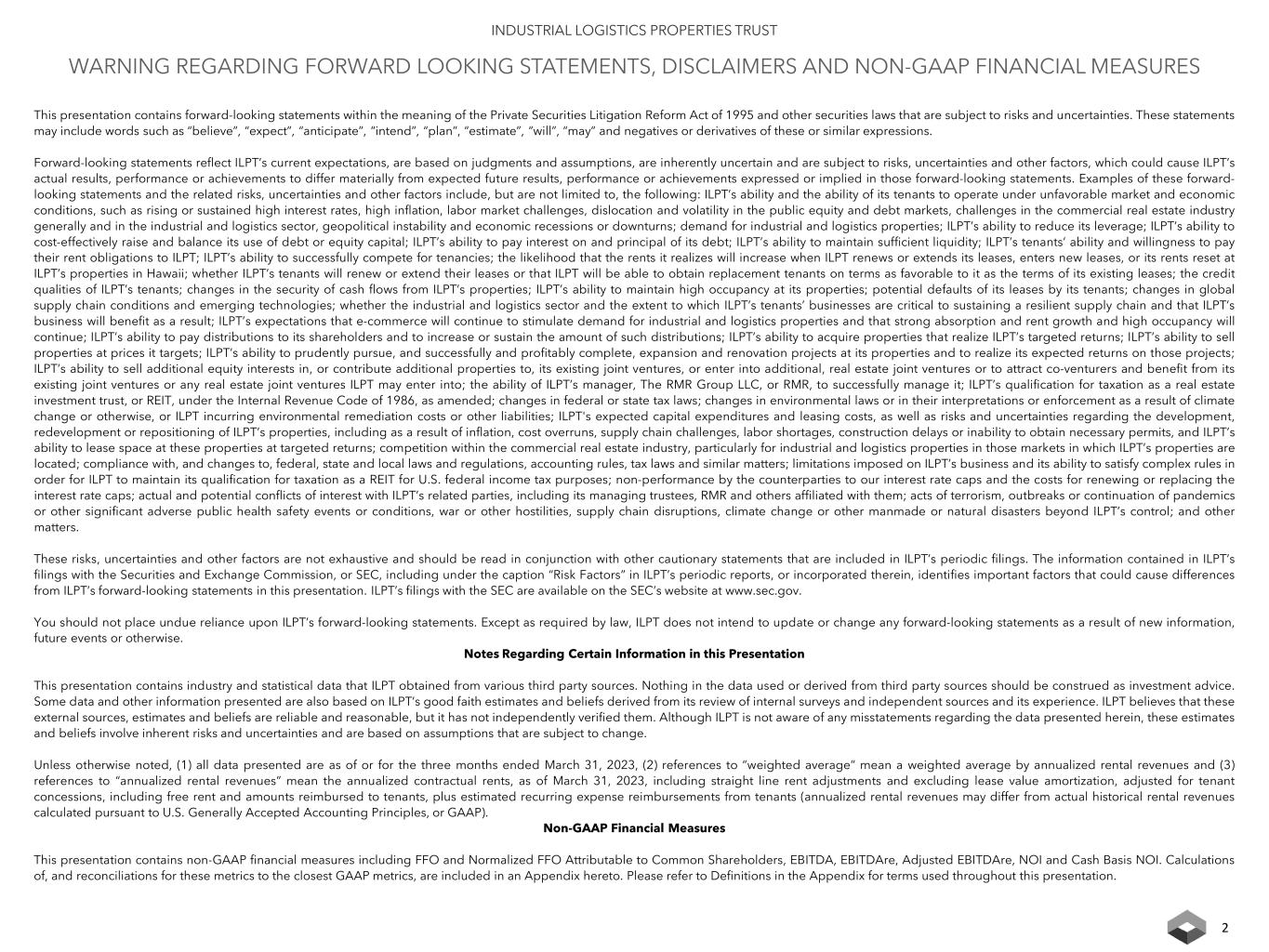 2 INDUSTRIAL LOGISTICS PROPERTIES TRUST This presentation contains forward-looking statements within the meaning of the Private Securities Litigation Reform Act of 1995 and other securities laws that are subject to risks and uncertainties. These statements may include words such as “believe”, “expect”, “anticipate”, “intend”, “plan”, “estimate”, “will”, “may” and negatives or derivatives of these or similar expressions. Forward-looking statements reflect ILPT’s current expectations, are based on judgments and assumptions, are inherently uncertain and are subject to risks, uncertainties and other factors, which could cause ILPT’s actual results, performance or achievements to differ materially from expected future results, performance or achievements expressed or implied in those forward-looking statements. Examples of these forward- looking statements and the related risks, uncertainties and other factors include, but are not limited to, the following: ILPT’s ability and the ability of its tenants to operate under unfavorable market and economic conditions, such as rising or sustained high interest rates, high inflation, labor market challenges, dislocation and volatility in the public equity and debt markets, challenges in the commercial real estate industry generally and in the industrial and logistics sector, geopolitical instability and economic recessions or downturns; demand for industrial and logistics properties; ILPT’s ability to reduce its leverage; ILPT’s ability to cost-effectively raise and balance its use of debt or equity capital; ILPT’s ability to pay interest on and principal of its debt; ILPT’s ability to maintain sufficient liquidity; ILPT’s tenants’ ability and willingness to pay their rent obligations to ILPT; ILPT’s ability to successfully compete for tenancies; the likelihood that the rents it realizes will increase when ILPT renews or extends its leases, enters new leases, or its rents reset at ILPT’s properties in Hawaii; whether ILPT’s tenants will renew or extend their leases or that ILPT will be able to obtain replacement tenants on terms as favorable to it as the terms of its existing leases; the credit qualities of ILPT’s tenants; changes in the security of cash flows from ILPT’s properties; ILPT’s ability to maintain high occupancy at its properties; potential defaults of its leases by its tenants; changes in global supply chain conditions and emerging technologies; whether the industrial and logistics sector and the extent to which ILPT’s tenants’ businesses are critical to sustaining a resilient supply chain and that ILPT’s business will benefit as a result; ILPT’s expectations that e-commerce will continue to stimulate demand for industrial and logistics properties and that strong absorption and rent growth and high occupancy will continue; ILPT’s ability to pay distributions to its shareholders and to increase or sustain the amount of such distributions; ILPT’s ability to acquire properties that realize ILPT’s targeted returns; ILPT’s ability to sell properties at prices it targets; ILPT’s ability to prudently pursue, and successfully and profitably complete, expansion and renovation projects at its properties and to realize its expected returns on those projects; ILPT’s ability to sell additional equity interests in, or contribute additional properties to, its existing joint ventures, or enter into additional, real estate joint ventures or to attract co-venturers and benefit from its existing joint ventures or any real estate joint ventures ILPT may enter into; the ability of ILPT’s manager, The RMR Group LLC, or RMR, to successfully manage it; ILPT’s qualification for taxation as a real estate investment trust, or REIT, under the Internal Revenue Code of 1986, as amended; changes in federal or state tax laws; changes in environmental laws or in their interpretations or enforcement as a result of climate change or otherwise, or ILPT incurring environmental remediation costs or other liabilities; ILPT's expected capital expenditures and leasing costs, as well as risks and uncertainties regarding the development, redevelopment or repositioning of ILPT’s properties, including as a result of inflation, cost overruns, supply chain challenges, labor shortages, construction delays or inability to obtain necessary permits, and ILPT’s ability to lease space at these properties at targeted returns; competition within the commercial real estate industry, particularly for industrial and logistics properties in those markets in which ILPT’s properties are located; compliance with, and changes to, federal, state and local laws and regulations, accounting rules, tax laws and similar matters; limitations imposed on ILPT’s business and its ability to satisfy complex rules in order for ILPT to maintain its qualification for taxation as a REIT for U.S. federal income tax purposes; non-performance by the counterparties to our interest rate caps and the costs for renewing or replacing the interest rate caps; actual and potential conflicts of interest with ILPT’s related parties, including its managing trustees, RMR and others affiliated with them; acts of terrorism, outbreaks or continuation of pandemics or other significant adverse public health safety events or conditions, war or other hostilities, supply chain disruptions, climate change or other manmade or natural disasters beyond ILPT’s control; and other matters. These risks, uncertainties and other factors are not exhaustive and should be read in conjunction with other cautionary statements that are included in ILPT’s periodic filings. The information contained in ILPT’s filings with the Securities and Exchange Commission, or SEC, including under the caption “Risk Factors” in ILPT’s periodic reports, or incorporated therein, identifies important factors that could cause differences from ILPT’s forward-lookin