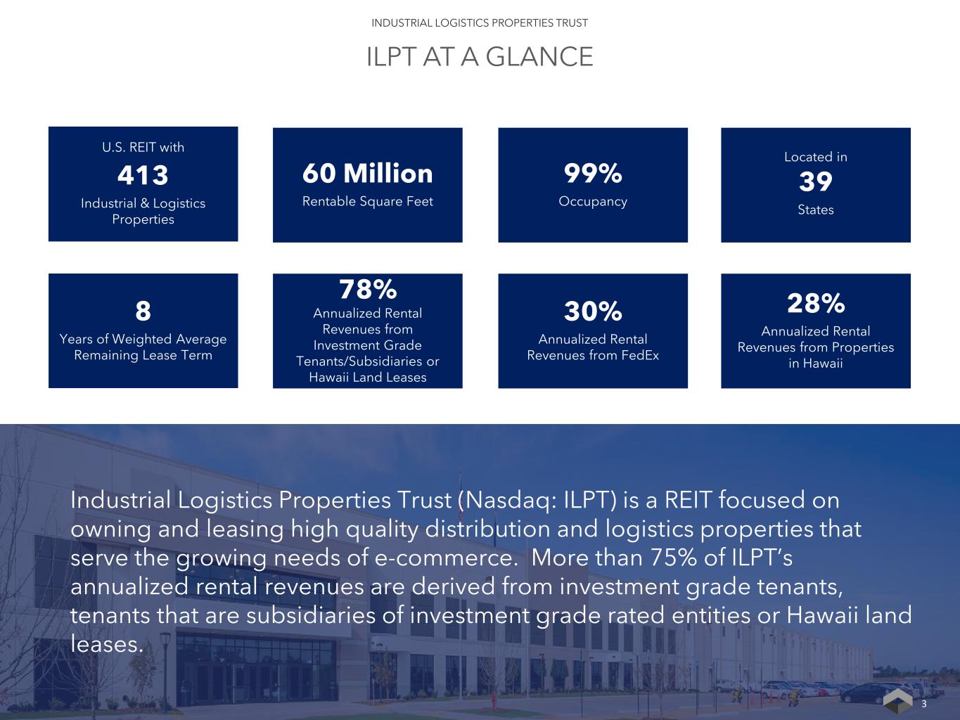 2 INDUSTRIAL LOGISTICS PROPERTIES TRUST This presentation contains forward-looking statements within the meaning of the Private Securities Litigation Reform Act of 1995 and other securities laws that are subject to risks and uncertainties. These statements may include words such as “believe”, “expect”, “anticipate”, “intend”, “plan”, “estimate”, “will”, “may” and negatives or derivatives of these or similar expressions. Forward-looking statements reflect ILPT’s current expectations, are based on judgments and assumptions, are inherently uncertain and are subject to risks, uncertainties and other factors, which could cause ILPT’s actual results, performance or achievements to differ materially from expected future results, performance or achievements expressed or implied in those forward-looking statements. Examples of these forward- looking statements and the related risks, uncertainties and other factors include, but are not limited to, the following: ILPT’s ability and the ability of its tenants to operate under unfavorable market and economic conditions, such as rising or sustained high interest rates, high inflation, labor market challenges, dislocation and volatility in the public equity and debt markets, challenges in the commercial real estate industry generally and in the industrial and logistics sector, geopolitical instability and economic recessions or downturns; demand for industrial and logistics properties; ILPT’s ability to reduce its leverage; ILPT’s ability to cost-effectively raise and balance its use of debt or equity capital; ILPT’s ability to pay interest on and principal of its debt; ILPT’s ability to maintain sufficient liquidity; ILPT’s tenants’ ability and willingness to pay their rent obligations to ILPT; ILPT’s ability to successfully compete for tenancies; the likelihood that the rents it realizes will increase when ILPT renews or extends its leases, enters new leases, or its rents reset at ILPT’s properties in Hawaii; whether ILPT’s tenants will renew or extend their leases or that ILPT will be able to obtain replacement tenants on terms as favorable to it as the terms of its existing leases; the credit qualities of ILPT’s tenants; changes in the security of cash flows from ILPT’s properties; ILPT’s ability to maintain high occupancy at its properties; potential defaults of its leases by its tenants; changes in global supply chain conditions and emerging technologies; whether the industrial and logistics sector and the extent to which ILPT’s tenants’ businesses are critical to sustaining a resilient supply chain and that ILPT’s business will benefit as a result; ILPT’s expectations that e-commerce will continue to stimulate demand for industrial and logistics properties and that strong absorption and rent growth and high occupancy will continue; ILPT’s ability to pay distributions to its shareholders and to increase or sustain the amount of such distributions; ILPT’s ability to acquire properties that realize ILPT’s targeted returns; ILPT’s ability to sell properties at prices it targets; ILPT’s ability to prudently pursue, and successfully and profitably complete, expansion and renovation projects at its properties and to realize its expected returns on those projects; ILPT’s ability to sell additional equity interests in, or contribute additional properties to, its existing joint ventures, or enter into additional, real estate joint ventures or to attract co-venturers and benefit from its existing joint ventures or any real estate joint ventures ILPT may enter into; the ability of ILPT’s manager, The RMR Group LLC, or RMR, to successfully manage it; ILPT’s qualification for taxation as a real estate investment trust, or REIT, under the Internal Revenue Code of 1986, as amended; changes in federal or state tax laws; changes in environmental laws or in their interpretations or enforcement as a result of climate change or otherwise, or ILPT incurring environmental remediation costs or other liabilities; ILPT's expected capital expenditures and leasing costs, as well as risks and uncertainties regarding the development, redevelopment or repositioning of ILPT’s properties, including as a result of inflation, cost overruns, supply chain challenges, labor shortages, construction delays or inability to obtain necessary permits, and ILPT’s ability to lease space at these properties at targeted returns; competition within the commercial real estate industry, particularly for industrial and logistics properties in those markets in which ILPT’s properties are located; compliance with, and changes to, federal, state and local laws and regulations, accounting rules, tax laws and similar matters; limitations imposed on ILPT’s business and its ability to satisfy complex rules in order for ILPT to maintain its qualification for taxation as a REIT for U.S. federal income tax purposes; non-performance by the counterparties to our interest rate caps and the costs for renewing or replacing the interest rate caps; actual and potential conflicts of interest with ILPT’s related parties, including its managing trustees, RMR and others affiliated with them; acts of terrorism, outbreaks or continuation of pandemics or other significant adverse public health safety events or conditions, war or other hostilities, supply chain disruptions, climate change or other manmade or natural disasters beyond ILPT’s control; and other matters. These risks, uncertainties and other factors are not exhaustive and should be read in conjunction with other cautionary statements that are included in ILPT’s periodic filings. The information contained in ILPT’s filings with the Securities and Exchange Commission, or SEC, including under the caption “Risk Factors” in ILPT’s periodic reports, or incorporated therein, identifies important factors that could cause differences from ILPT’s forward-lookin