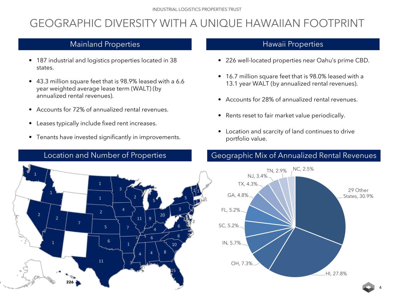 3 INDUSTRIAL LOGISTICS PROPERTIES TRUST 3 U.S. REIT with 413 Industrial & Logistics Properties ILPT AT A GLANCE Industrial Logistics Properties Trust (Nasdaq: ILPT) is a REIT focused on owning and leasing high quality distribution and logistics properties that serve the growing needs of e-commerce. More than 75% of ILPT’s annualized rental revenues are derived from investment grade tenants, tenants that are subsidiaries of investment grade rated entities or Hawaii land leases. 30% Annualized Rental Revenues from FedEx 60 Million Rentable Square Feet Located in 39 States 8 Years of Weighted Average Remaining Lease Term 78% Annualized Rental Revenues from Investment Grade Tenants/Subsidiaries or Hawaii Land Leases 99% Occupancy 28% Annualized Rental Revenues from Properties in Hawaii