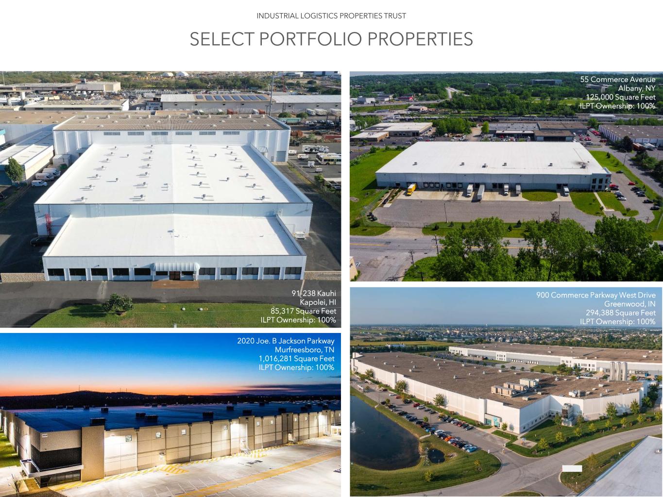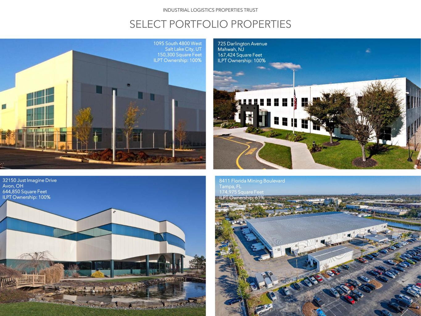 INDUSTRIAL LOGISTICS PROPERTIES TRUST SELECT PORTFOLIO PROPERTIES 725 Darlington Avenue Mahwah, NJ 167,424 Square Feet ILPT Ownership: 100% 1095 South 4800 West Salt Lake City, UT 150,300 Square Feet ILPT Ownership: 100% 8 32150 Just Imagine Drive Avon, OH 644,850 Square Feet ILPT Ownership: 100% 8411 Florida Mining Boulevard Tampa, FL 174,975 Square Feet ILPT Ownership: 61%