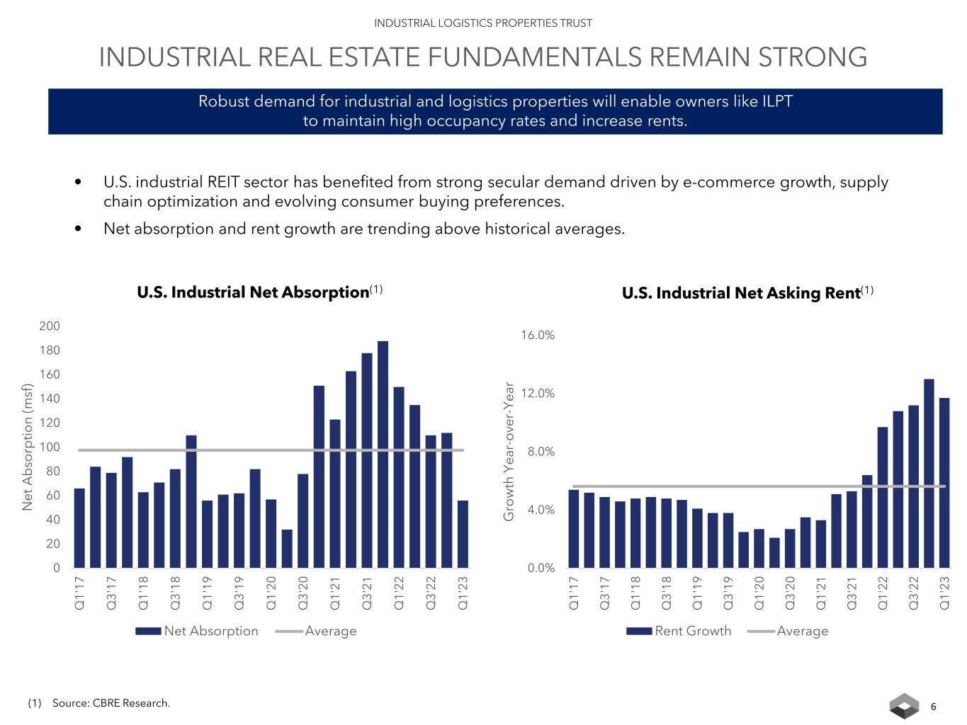 2 INDUSTRIAL LOGISTICS PROPERTIES TRUST This presentation contains forward-looking statements within the meaning of the Private Securities Litigation Reform Act of 1995 and other securities laws that are subject to risks and uncertainties. These statements may include words such as “believe”, “expect”, “anticipate”, “intend”, “plan”, “estimate”, “will”, “may” and negatives or derivatives of these or similar expressions. Forward-looking statements reflect ILPT’s current expectations, are based on judgments and assumptions, are inherently uncertain and are subject to risks, uncertainties and other factors, which could cause ILPT’s actual results, performance or achievements to differ materially from expected future results, performance or achievements expressed or implied in those forward-looking statements. Examples of these forward- looking statements and the related risks, uncertainties and other factors include, but are not limited to, the following: ILPT’s ability and the ability of its tenants to operate under unfavorable market and economic conditions, such as rising or sustained high interest rates, high inflation, labor market challenges, dislocation and volatility in the public equity and debt markets, challenges in the commercial real estate industry generally and in the industrial and logistics sector, geopolitical instability and economic recessions or downturns; demand for industrial and logistics properties; ILPT’s ability to reduce its leverage; ILPT’s ability to cost-effectively raise and balance its use of debt or equity capital; ILPT’s ability to pay interest on and principal of its debt; ILPT’s ability to maintain sufficient liquidity; ILPT’s tenants’ ability and willingness to pay their rent obligations to ILPT; ILPT’s ability to successfully compete for tenancies; the likelihood that the rents it realizes will increase when ILPT renews or extends its leases, enters new leases, or its rents reset at ILPT’s properties in Hawaii; whether ILPT’s tenants will renew or extend their leases or that ILPT will be able to obtain replacement tenants on terms as favorable to it as the terms of its existing leases; the credit qualities of ILPT’s tenants; changes in the security of cash flows from ILPT’s properties; ILPT’s ability to maintain high occupancy at its properties; potential defaults of its leases by its tenants; changes in global supply chain conditions and emerging technologies; whether the industrial and logistics sector and the extent to which ILPT’s tenants’ businesses are critical to sustaining a resilient supply chain and that ILPT’s business will benefit as a result; ILPT’s expectations that e-commerce will continue to stimulate demand for industrial and logistics properties and that strong absorption and rent growth and high occupancy will continue; ILPT’s ability to pay distributions to its shareholders and to increase or sustain the amount of such distributions; ILPT’s ability to acquire properties that realize ILPT’s targeted returns; ILPT’s ability to sell properties at prices it targets; ILPT’s ability to prudently pursue, and successfully and profitably complete, expansion and renovation projects at its properties and to realize its expected returns on those projects; ILPT’s ability to sell additional equity interests in, or contribute additional properties to, its existing joint ventures, or enter into additional, real estate joint ventures or to attract co-venturers and benefit from its existing joint ventures or any real estate joint ventures ILPT may enter into; the ability of ILPT’s manager, The RMR Group LLC, or RMR, to successfully manage it; ILPT’s qualification for taxation as a real estate investment trust, or REIT, under the Internal Revenue Code of 1986, as amended; changes in federal or state tax laws; changes in environmental laws or in their interpretations or enforcement as a result of climate change or otherwise, or ILPT incurring environmental remediation costs or other liabilities; ILPT's expected capital expenditures and leasing costs, as well as risks and uncertainties regarding the development, redevelopment or repositioning of ILPT’s properties, including as a result of inflation, cost overruns, supply chain challenges, labor shortages, construction delays or inability to obtain necessary permits, and ILPT’s ability to lease space at these properties at targeted returns; competition within the commercial real estate industry, particularly for industrial and logistics properties in those markets in which ILPT’s properties are located; compliance with, and changes to, federal, state and local laws and regulations, accounting rules, tax laws and similar matters; limitations imposed on ILPT’s business and its ability to satisfy complex rules in order for ILPT to maintain its qualification for taxation as a REIT for U.S. federal income tax purposes; non-performance by the counterparties to our interest rate caps and the costs for renewing or replacing the interest rate caps; actual and potential conflicts of interest with ILPT’s related parties, including its managing trustees, RMR and others affiliated with them; acts of terrorism, outbreaks or continuation of pandemics or other significant adverse public health safety events or conditions, war or other hostilities, supply chain disruptions, climate change or other manmade or natural disasters beyond ILPT’s control; and other matters. These risks, uncertainties and other factors are not exhaustive and should be read in conjunction with other cautionary statements that are included in ILPT’s periodic filings. The information contained in ILPT’s filings with the Securities and Exchange Commission, or SEC, including under the caption “Risk Factors” in ILPT’s periodic reports, or incorporated therein, identifies important factors that could cause differences from ILPT’s forward-lookin