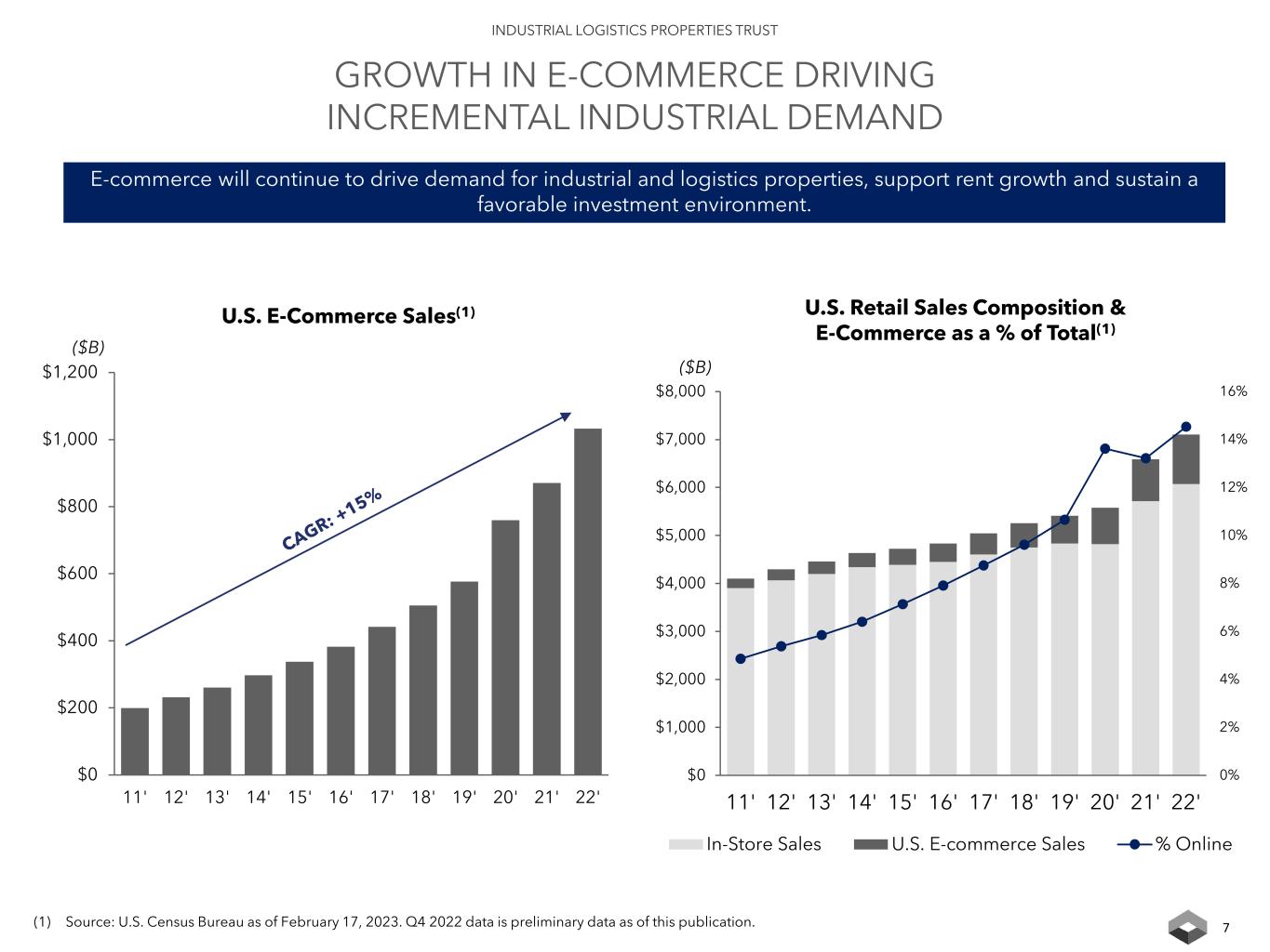 6 INDUSTRIAL LOGISTICS PROPERTIES TRUST INDUSTRIAL REAL ESTATE FUNDAMENTALS REMAIN STRONG Robust demand for industrial and logistics properties will enable owners like ILPT to maintain high occupancy rates and increase rents. • U.S. industrial REIT sector has benefited from strong secular demand driven by e-commerce growth, supply chain optimization and evolving consumer buying preferences. • Net absorption and rent growth are trending above historical averages. (1) Source: CBRE Research. U.S. Industrial Net Absorption(1) U.S. Industrial Net Asking Rent(1) 0 20 40 60 80 100 120 140 160 180 200 Q 1' 17 Q 3' 17 Q 1' 18 Q 3' 18 Q 1' 19 Q 3' 19 Q 1' 20 Q 3' 20 Q 1' 21 Q 3' 21 Q 1' 22 Q 3' 22 Q 1' 23 N et A b so rp tio n (m sf ) Net Absorption Average 0.0% 4.0% 8.0% 12.0% 16.0% Q 1' 17 Q 3' 17 Q 1' 18 Q 3' 18 Q 1' 19 Q 3' 19 Q 1' 20 Q 3' 20 Q 1' 21 Q 3' 21 Q 1' 22 Q 3' 22 Q 1' 23 G ro w th Y ea r- o ve r- Y ea r Rent Growth Average