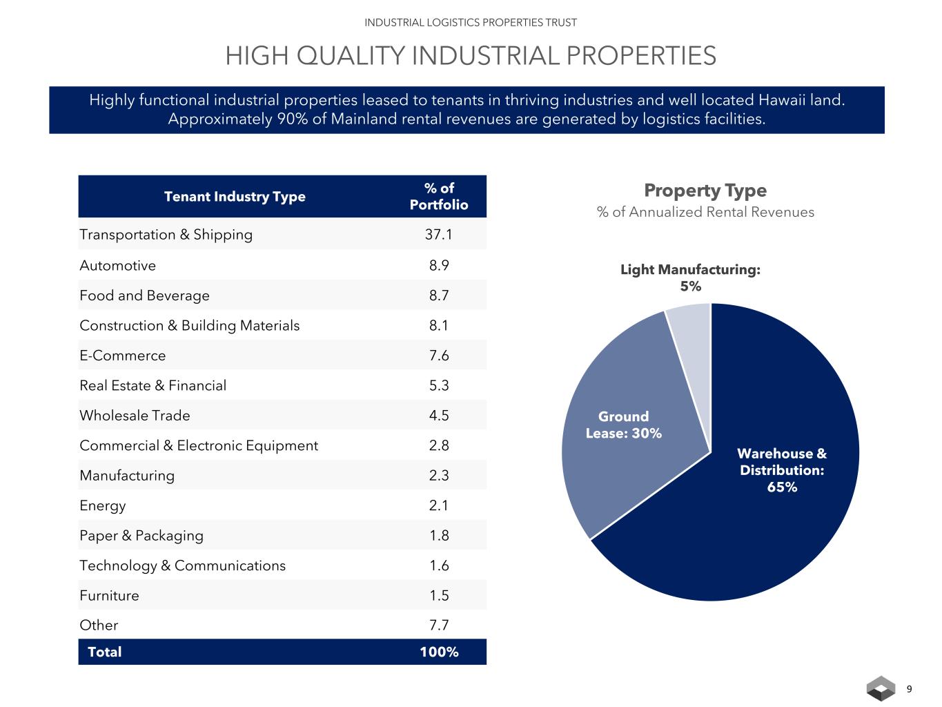 9 INDUSTRIAL LOGISTICS PROPERTIES TRUST Warehouse & Distribution: 65% Ground Lease: 30% Light Manufacturing: 5% HIGH QUALITY INDUSTRIAL PROPERTIES Property Type % of Annualized Rental Revenues Tenant Industry Type % of Portfolio Transportation & Shipping 37.1 Automotive 8.9 Food and Beverage 8.7 Construction & Building Materials 8.1 E-Commerce 7.6 Real Estate & Financial 5.3 Wholesale Trade 4.5 Commercial & Electronic Equipment 2.8 Manufacturing 2.3 Energy 2.1 Paper & Packaging 1.8 Technology & Communications 1.6 Furniture 1.5 Other 7.7 Total 100% Highly functional industrial properties leased to tenants in thriving industries and well located Hawaii land. Approximately 90% of Mainland rental revenues are generated by logistics facilities.