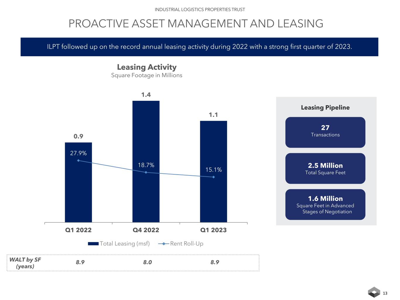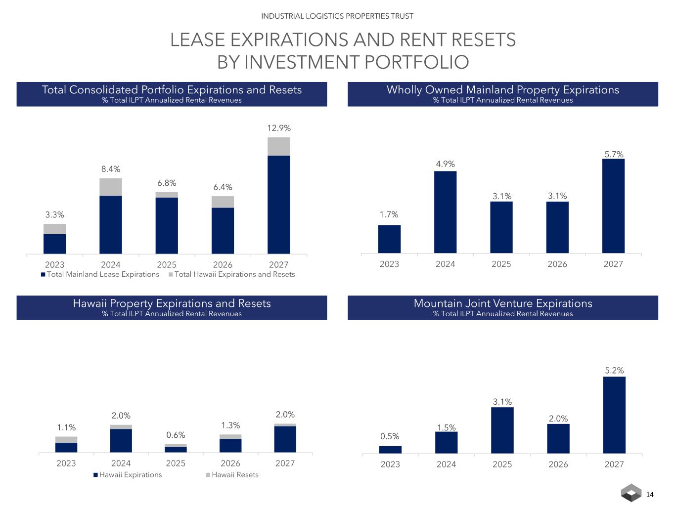 12 INDUSTRIAL LOGISTICS PROPERTIES TRUST Mountain Industrial JV(1) Consolidated ILPT 61% Ownership 94 Properties 98.3% Occupancy $32.9M NOI $31.7M Cash Basis NOI $29.5M Adjusted EBITDAre $3.1B Total Gross Assets (1) Amounts represent this joint venture at 100%, not ILPT’s proportionate share thereof. INVESTMENT PORTFOLIO Q1 2023 RESULTS $1.7B Total Debt (Principal) Mainland Properties 92 Properties 99.6% Occupancy $29.2M NOI $29.0M Cash Basis NOI $26.9M Adjusted EBITDAre $1.9B Total Gross Assets $1.7B Total Debt (Principal) Hawaii Properties 226 Properties 98.0% Occupancy $22.1M NOI $19.5M Cash Basis NOI $21.2M Adjusted EBITDAre $724.3M Total Gross Assets $863.9M Total Debt (Principal) 100% Ownership $9.3M Normalized FFO -$3.7M Normalized FFO $1.0M Normalized FFO 107,000 SF Leasing Activity +23.5% Rental Rates 428,000 SF Leasing Activity +13.7% Rental Rates 587,000 SF Leasing Activity +14.1% Rental Rates 12