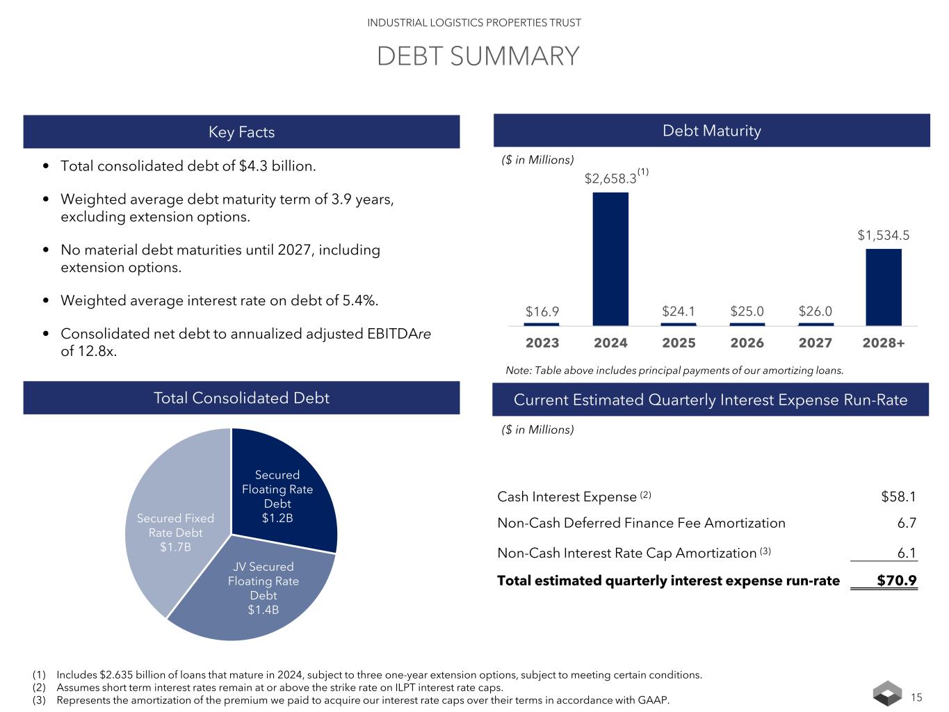 2 INDUSTRIAL LOGISTICS PROPERTIES TRUST This presentation contains forward-looking statements within the meaning of the Private Securities Litigation Reform Act of 1995 and other securities laws that are subject to risks and uncertainties. These statements may include words such as “believe”, “expect”, “anticipate”, “intend”, “plan”, “estimate”, “will”, “may” and negatives or derivatives of these or similar expressions. Forward-looking statements reflect ILPT’s current expectations, are based on judgments and assumptions, are inherently uncertain and are subject to risks, uncertainties and other factors, which could cause ILPT’s actual results, performance or achievements to differ materially from expected future results, performance or achievements expressed or implied in those forward-looking statements. Examples of these forward- looking statements and the related risks, uncertainties and other factors include, but are not limited to, the following: ILPT’s ability and the ability of its tenants to operate under unfavorable market and economic conditions, such as rising or sustained high interest rates, high inflation, labor market challenges, dislocation and volatility in the public equity and debt markets, challenges in the commercial real estate industry generally and in the industrial and logistics sector, geopolitical instability and economic recessions or downturns; demand for industrial and logistics properties; ILPT’s ability to reduce its leverage; ILPT’s ability to cost-effectively raise and balance its use of debt or equity capital; ILPT’s ability to pay interest on and principal of its debt; ILPT’s ability to maintain sufficient liquidity; ILPT’s tenants’ ability and willingness to pay their rent obligations to ILPT; ILPT’s ability to successfully compete for tenancies; the likelihood that the rents it realizes will increase when ILPT renews or extends its leases, enters new leases, or its rents reset at ILPT’s properties in Hawaii; whether ILPT’s tenants will renew or extend their leases or that ILPT will be able to obtain replacement tenants on terms as favorable to it as the terms of its existing leases; the credit qualities of ILPT’s tenants; changes in the security of cash flows from ILPT’s properties; ILPT’s ability to maintain high occupancy at its properties; potential defaults of its leases by its tenants; changes in global supply chain conditions and emerging technologies; whether the industrial and logistics sector and the extent to which ILPT’s tenants’ businesses are critical to sustaining a resilient supply chain and that ILPT’s business will benefit as a result; ILPT’s expectations that e-commerce will continue to stimulate demand for industrial and logistics properties and that strong absorption and rent growth and high occupancy will continue; ILPT’s ability to pay distributions to its shareholders and to increase or sustain the amount of such distributions; ILPT’s ability to acquire properties that realize ILPT’s targeted returns; ILPT’s ability to sell properties at prices it targets; ILPT’s ability to prudently pursue, and successfully and profitably complete, expansion and renovation projects at its properties and to realize its expected returns on those projects; ILPT’s ability to sell additional equity interests in, or contribute additional properties to, its existing joint ventures, or enter into additional, real estate joint ventures or to attract co-venturers and benefit from its existing joint ventures or any real estate joint ventures ILPT may enter into; the ability of ILPT’s manager, The RMR Group LLC, or RMR, to successfully manage it; ILPT’s qualification for taxation as a real estate investment trust, or REIT, under the Internal Revenue Code of 1986, as amended; changes in federal or state tax laws; changes in environmental laws or in their interpretations or enforcement as a result of climate change or otherwise, or ILPT incurring environmental remediation costs or other liabilities; ILPT's expected capital expenditures and leasing costs, as well as risks and uncertainties regarding the development, redevelopment or repositioning of ILPT’s properties, including as a result of inflation, cost overruns, supply chain challenges, labor shortages, construction delays or inability to obtain necessary permits, and ILPT’s ability to lease space at these properties at targeted returns; competition within the commercial real estate industry, particularly for industrial and logistics properties in those markets in which ILPT’s properties are located; compliance with, and changes to, federal, state and local laws and regulations, accounting rules, tax laws and similar matters; limitations imposed on ILPT’s business and its ability to satisfy complex rules in order for ILPT to maintain its qualification for taxation as a REIT for U.S. federal income tax purposes; non-performance by the counterparties to our interest rate caps and the costs for renewing or replacing the interest rate caps; actual and potential conflicts of interest with ILPT’s related parties, including its managing trustees, RMR and others affiliated with them; acts of terrorism, outbreaks or continuation of pandemics or other significant adverse public health safety events or conditions, war or other hostilities, supply chain disruptions, climate change or other manmade or natural disasters beyond ILPT’s control; and other matters. These risks, uncertainties and other factors are not exhaustive and should be read in conjunction with other cautionary statements that are included in ILPT’s periodic filings. The information contained in ILPT’s filings with the Securities and Exchange Commission, or SEC, including under the caption “Risk Factors” in ILPT’s periodic reports, or incorporated therein, identifies important factors that could cause differences from ILPT’s forward-lookin
