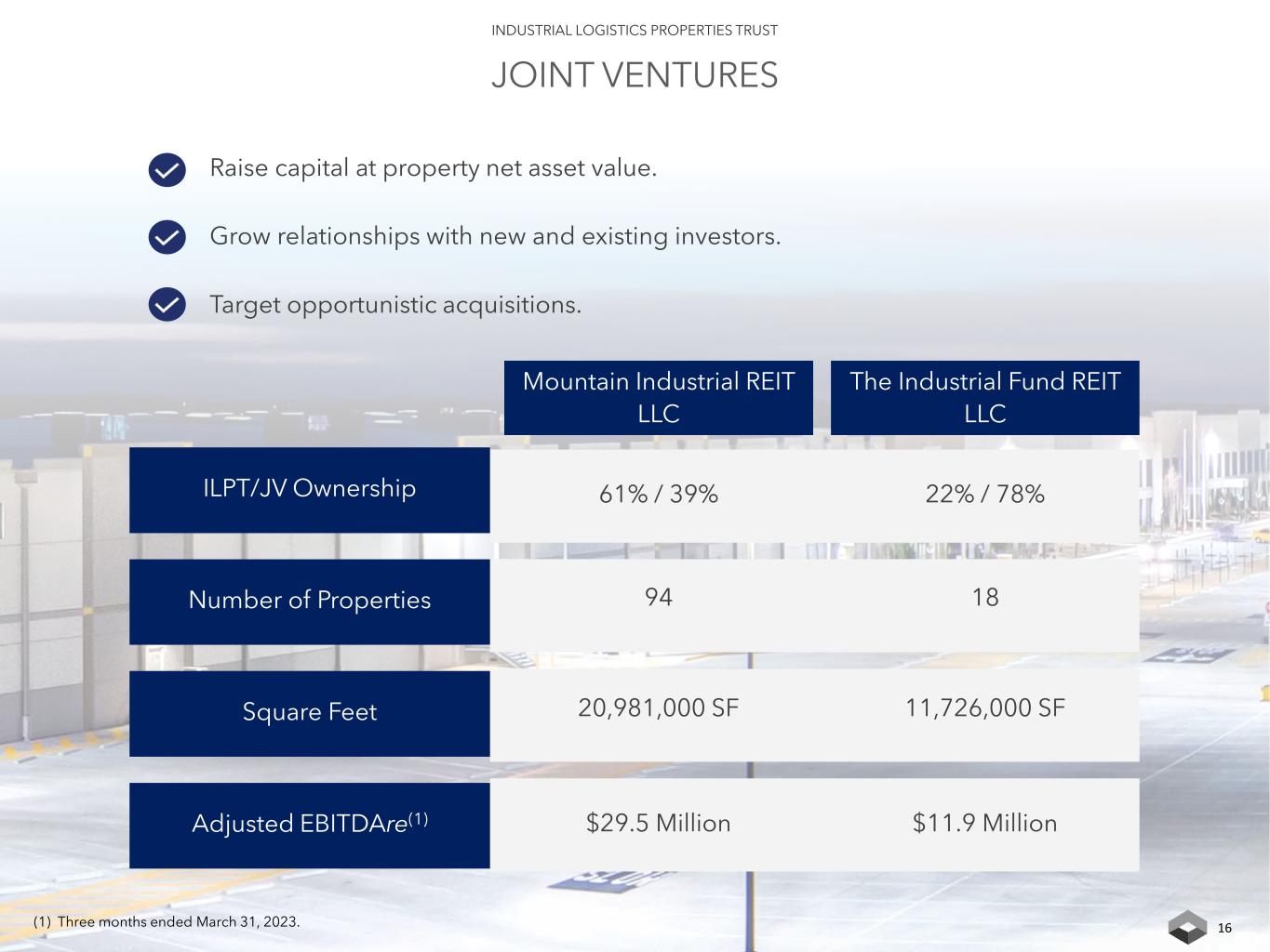 DEBT SUMMARY 15 Secured Floating Rate Debt $1.2B JV Secured Floating Rate Debt $1.4B Secured Fixed Rate Debt $1.7B $16.9 $2,658.3 $24.1 $25.0 $26.0 $1,534.5 2023 2024 2025 2026 2027 2028+ INDUSTRIAL LOGISTICS PROPERTIES TRUST Key Facts Debt Maturity Total Consolidated Debt Current Estimated Quarterly Interest Expense Run-Rate • Total consolidated debt of $4.3 billion. • Weighted average debt maturity term of 3.9 years, excluding extension options. • No material debt maturities until 2027, including extension options. • Weighted average interest rate on debt of 5.4%. • Consolidated net debt to annualized adjusted EBITDAre of 12.8x. (1) Includes $2.635 billion of loans that mature in 2024, subject to three one-year extension options, subject to meeting certain conditions. (2) Assumes short term interest rates remain at or above the strike rate on ILPT interest rate caps. (3) Represents the amortization of the premium we paid to acquire our interest rate caps over their terms in accordance with GAAP. ($ in Millions) ($ in Millions) (1) Cash Interest Expense (2) $58.1 Non-Cash Deferred Finance Fee Amortization 6.7 Non-Cash Interest Rate Cap Amortization (3) 6.1 Total estimated quarterly interest expense run-rate $70.9 Note: Table above includes principal payments of our amortizing loans.