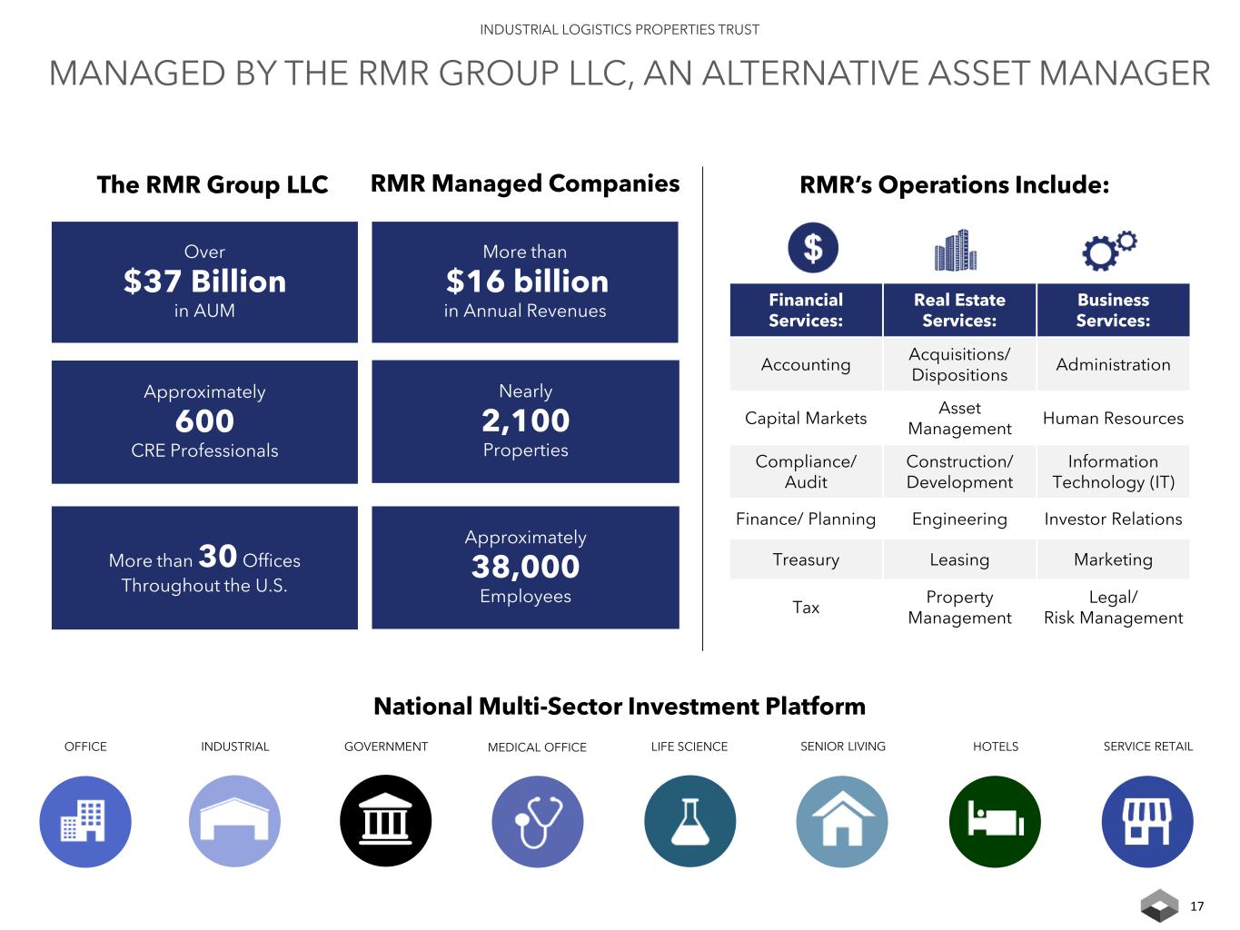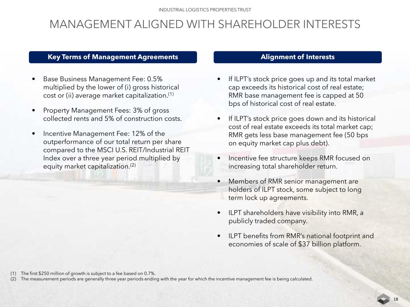 17 INDUSTRIAL LOGISTICS PROPERTIES TRUST RMR’s Operations Include: National Multi-Sector Investment Platform OFFICE INDUSTRIAL GOVERNMENT MEDICAL OFFICE LIFE SCIENCE SENIOR LIVING HOTELS SERVICE RETAIL RMR Managed Companies Approximately 38,000 Employees Nearly 2,100 Properties More than $16 billion in Annual Revenues Over $37 Billion in AUM Approximately 600 CRE Professionals More than 30 Offices Throughout the U.S. Financial Services: Real Estate Services: Business Services: Accounting Acquisitions/ Dispositions Administration Capital Markets Asset Management Human Resources Compliance/ Audit Construction/ Development Information Technology (IT) Finance/ Planning Engineering Investor Relations Treasury Leasing Marketing Tax Property Management Legal/ Risk Management MANAGED BY THE RMR GROUP LLC, AN ALTERNATIVE ASSET MANAGER The RMR Group LLC