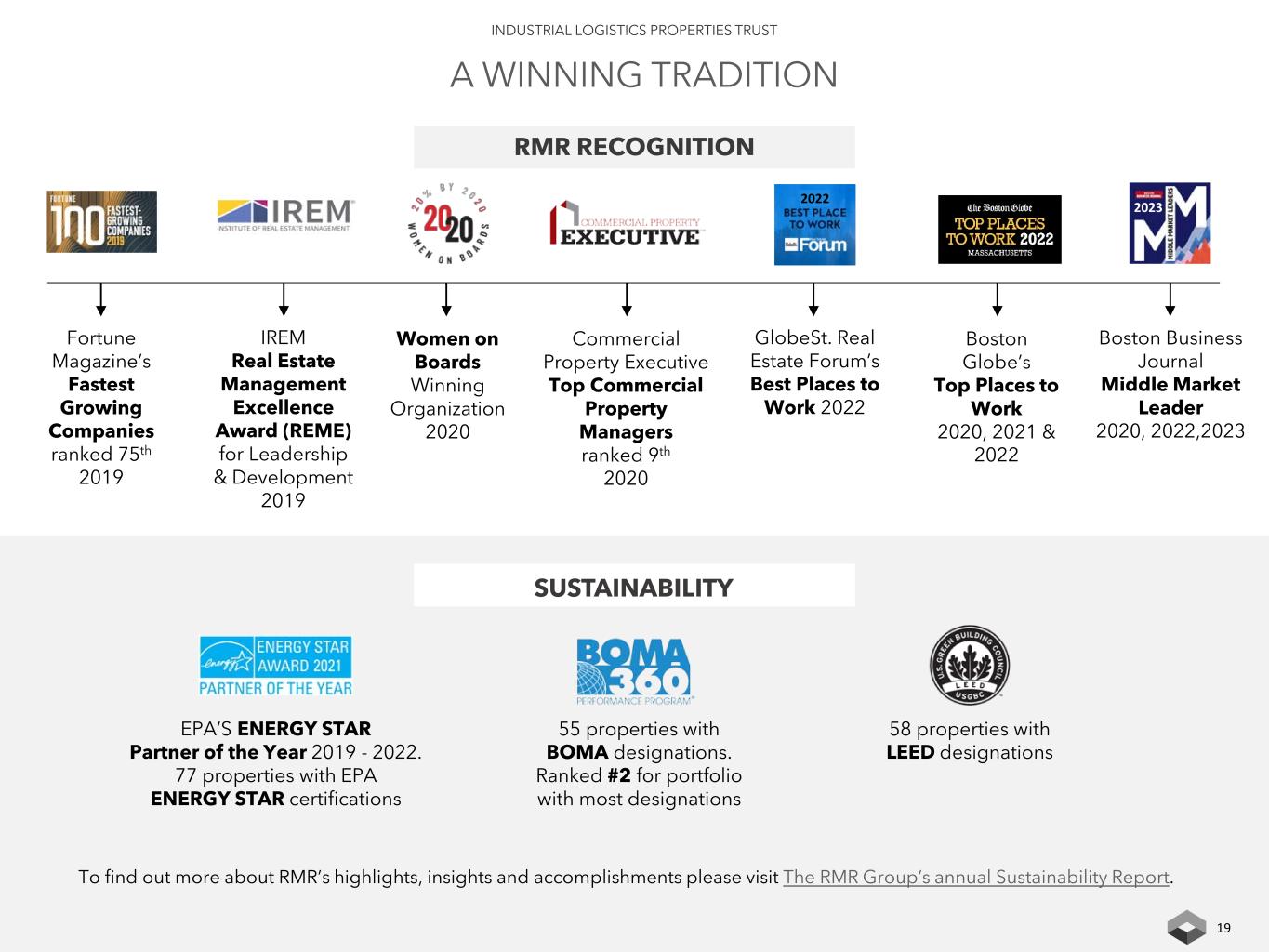 18 INDUSTRIAL LOGISTICS PROPERTIES TRUST • Base Business Management Fee: 0.5% multiplied by the lower of (i) gross historical cost or (ii) average market capitalization.(1) • Property Management Fees: 3% of gross collected rents and 5% of construction costs. • Incentive Management Fee: 12% of the outperformance of our total return per share compared to the MSCI U.S. REIT/Industrial REIT Index over a three year period multiplied by equity market capitalization.(2) (1) The first $250 million of growth is subject to a fee based on 0.7%. (2) The measurement periods are generally three year periods ending with the year for which the incentive management fee is being calculated. • If ILPT’s stock price goes up and its total market cap exceeds its historical cost of real estate; RMR base management fee is capped at 50 bps of historical cost of real estate. • If ILPT’s stock price goes down and its historical cost of real estate exceeds its total market cap; RMR gets less base management fee (50 bps on equity market cap plus debt). • Incentive fee structure keeps RMR focused on increasing total shareholder return. • Members of RMR senior management are holders of ILPT stock, some subject to long term lock up agreements. • ILPT shareholders have visibility into RMR, a publicly traded company. • ILPT benefits from RMR’s national footprint and economies of scale of $37 billion platform. Key Terms of Management Agreements MANAGEMENT ALIGNED WITH SHAREHOLDER INTERESTS Alignment of Interests
