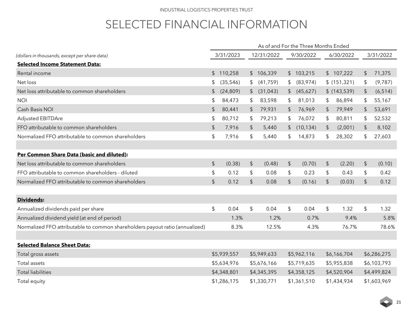 21 INDUSTRIAL LOGISTICS PROPERTIES TRUST As of and For the Three Months Ended 3/31/2023 12/31/2022 9/30/2022 6/30/2022 3/31/2022 Selected Income Statement Data: Rental income $ 110,258 $ 106,339 $ 103,215 $ 107,222 $ 71,375 Net loss $ (35,546) $ (41,759) $ (83,974) $ (151,321) $ (9,787) Net loss attributable to common shareholders $ (24,809) $ (31,043) $ (45,627) $ (143,539) $ (6,514) NOI $ 84,473 $ 83,598 $ 81,013 $ 86,894 $ 55,167 Cash Basis NOI $ 80,441 $ 79,931 $ 76,969 $ 79,949 $ 53,691 Adjusted EBITDAre $ 80,712 $ 79,213 $ 76,072 $ 80,811 $ 52,532 FFO attributable to common shareholders $ 7,916 $ 5,440 $ (10,134) $ (2,001) $ 8,102 Normalized FFO attributable to common shareholders $ 7,916 $ 5,440 $ 14,873 $ 28,302 $ 27,603 Per Common Share Data (basic and diluted): Net loss attributable to common shareholders $ (0.38) $ (0.48) $ (0.70) $ (2.20) $ (0.10) FFO attributable to common shareholders - diluted $ 0.12 $ 0.08 $ 0.23 $ 0.43 $ 0.42 Normalized FFO attributable to common shareholders $ 0.12 $ 0.08 $ (0.16) $ (0.03) $ 0.12 Dividends: Annualized dividends paid per share $ 0.04 $ 0.04 $ 0.04 $ 1.32 $ 1.32 Annualized dividend yield (at end of period) 1.3% 1.2% 0.7% 9.4% 5.8% Normalized FFO attributable to common shareholders payout ratio (annualized) 8.3% 12.5% 4.3% 76.7% 78.6% Selected Balance Sheet Data: Total gross assets $5,939,557 $5,949,633 $5,962,116 $6,166,704 $6,286,275 Total assets $5,634,976 $5,676,166 $5,719,635 $5,955,838 $6,103,793 Total liabilities $4,348,801 $4,345,395 $4,358,125 $4,520,904 $4,499,824 Total equity $1,286,175 $1,330,771 $1,361,510 $1,434,934 $1,603,969 SELECTED FINANCIAL INFORMATION (dollars in thousands, except per share data)