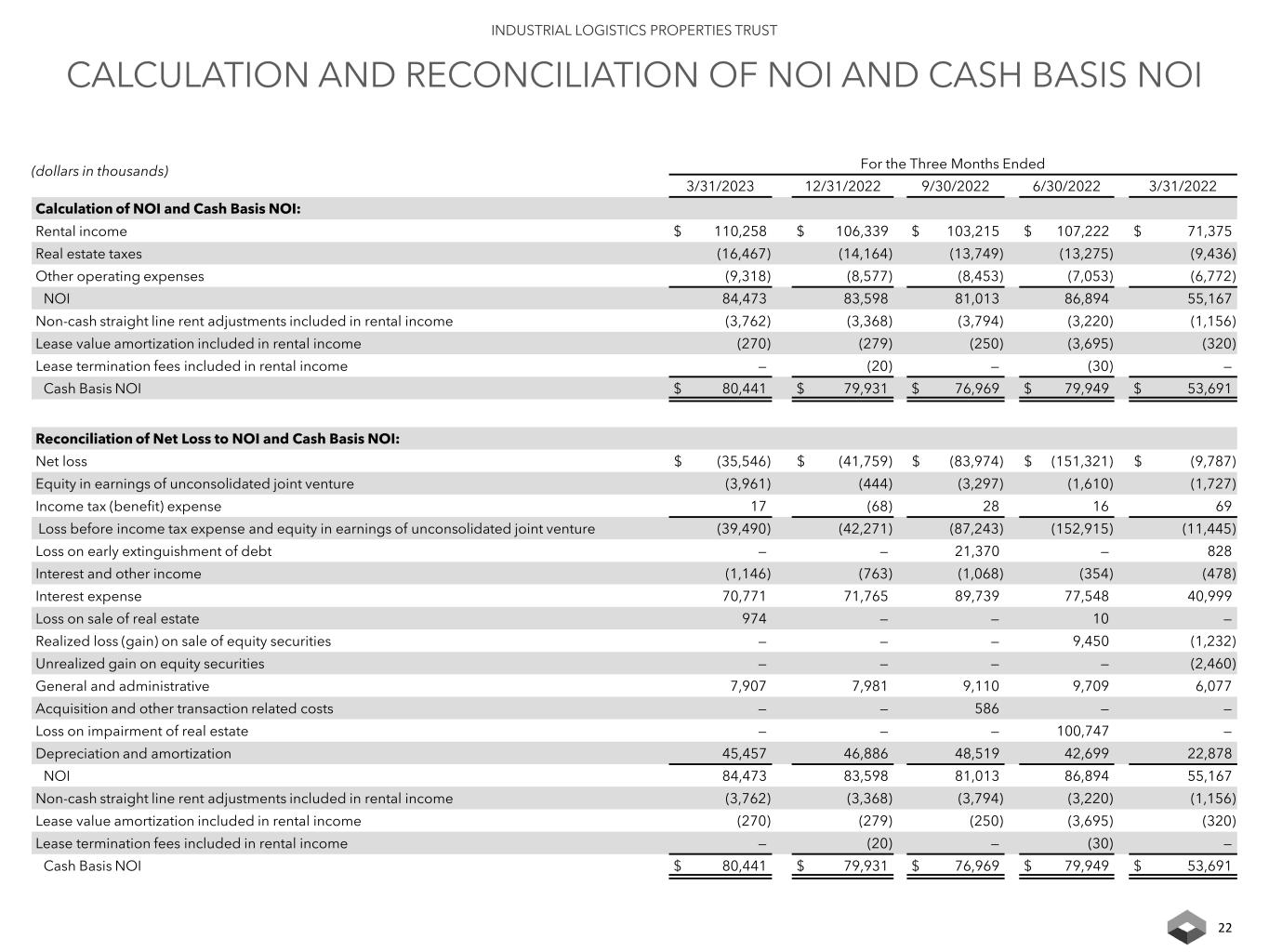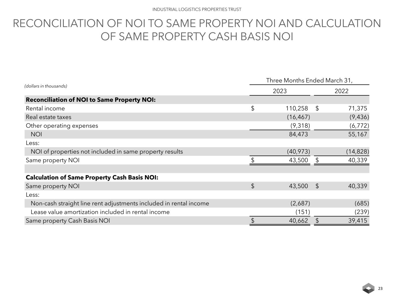 22 INDUSTRIAL LOGISTICS PROPERTIES TRUST For the Three Months Ended 3/31/2023 12/31/2022 9/30/2022 6/30/2022 3/31/2022 Calculation of NOI and Cash Basis NOI: Rental income $ 110,258 $ 106,339 $ 103,215 $ 107,222 $ 71,375 Real estate taxes (16,467) (14,164) (13,749) (13,275) (9,436) Other operating expenses (9,318) (8,577) (8,453) (7,053) (6,772) NOI 84,473 83,598 81,013 86,894 55,167 Non-cash straight line rent adjustments included in rental income (3,762) (3,368) (3,794) (3,220) (1,156) Lease value amortization included in rental income (270) (279) (250) (3,695) (320) Lease termination fees included in rental income — (20) — (30) — Cash Basis NOI $ 80,441 $ 79,931 $ 76,969 $ 79,949 $ 53,691 Reconciliation of Net Loss to NOI and Cash Basis NOI: Net loss $ (35,546) $ (41,759) $ (83,974) $ (151,321) $ (9,787) Equity in earnings of unconsolidated joint venture (3,961) (444) (3,297) (1,610) (1,727) Income tax (benefit) expense 17 (68) 28 16 69 Loss before income tax expense and equity in earnings of unconsolidated joint venture (39,490) (42,271) (87,243) (152,915) (11,445) Loss on early extinguishment of debt — — 21,370 — 828 Interest and other income (1,146) (763) (1,068) (354) (478) Interest expense 70,771 71,765 89,739 77,548 40,999 Loss on sale of real estate 974 — — 10 — Realized loss (gain) on sale of equity securities — — — 9,450 (1,232) Unrealized gain on equity securities — — — — (2,460) General and administrative 7,907 7,981 9,110 9,709 6,077 Acquisition and other transaction related costs — — 586 — — Loss on impairment of real estate — — — 100,747 — Depreciation and amortization 45,457 46,886 48,519 42,699 22,878 NOI 84,473 83,598 81,013 86,894 55,167 Non-cash straight line rent adjustments included in rental income (3,762) (3,368) (3,794) (3,220) (1,156) Lease value amortization included in rental income (270) (279) (250) (3,695) (320) Lease termination fees included in rental income — (20) — (30) — Cash Basis NOI $ 80,441 $ 79,931 $ 76,969 $ 79,949 $ 53,691 CALCULATION AND RECONCILIATION OF NOI AND CASH BASIS NOI (dollars in thousands)