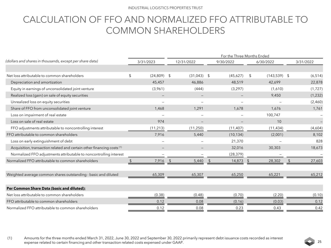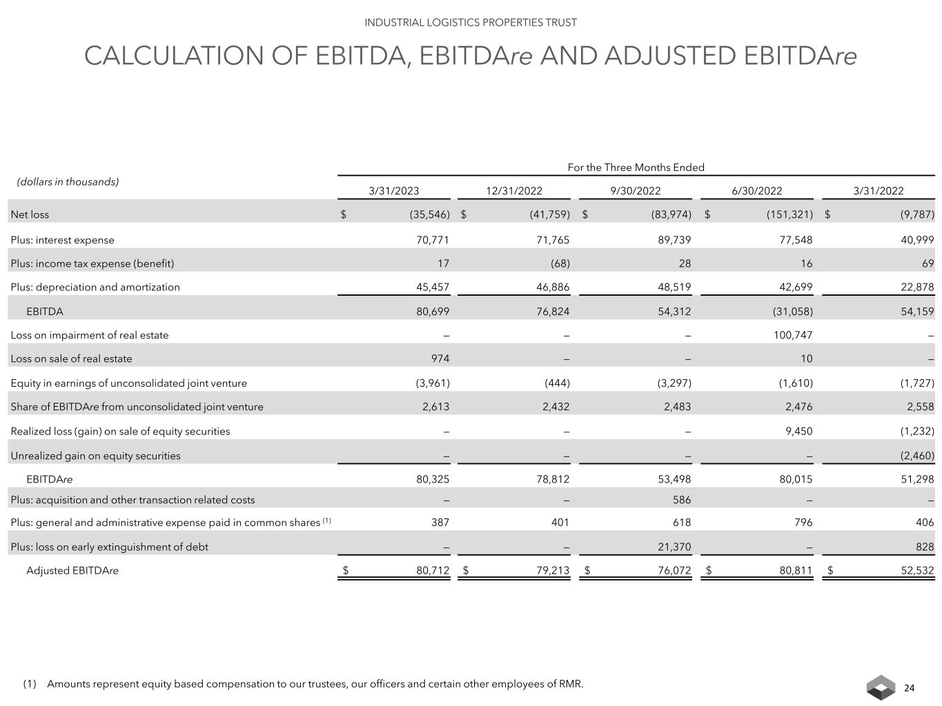 24 INDUSTRIAL LOGISTICS PROPERTIES TRUST For the Three Months Ended 3/31/2023 12/31/2022 9/30/2022 6/30/2022 3/31/2022 Net loss $ (35,546) $ (41,759) $ (83,974) $ (151,321) $ (9,787) Plus: interest expense 70,771 71,765 89,739 77,548 40,999 Plus: income tax expense (benefit) 17 (68) 28 16 69 Plus: depreciation and amortization 45,457 46,886 48,519 42,699 22,878 EBITDA 80,699 76,824 54,312 (31,058) 54,159 Loss on impairment of real estate — — — 100,747 — Loss on sale of real estate 974 — — 10 — Equity in earnings of unconsolidated joint venture (3,961) (444) (3,297) (1,610) (1,727) Share of EBITDAre from unconsolidated joint venture 2,613 2,432 2,483 2,476 2,558 Realized loss (gain) on sale of equity securities — — — 9,450 (1,232) Unrealized gain on equity securities — — — — (2,460) EBITDAre 80,325 78,812 53,498 80,015 51,298 Plus: acquisition and other transaction related costs — — 586 — — Plus: general and administrative expense paid in common shares (1) 387 401 618 796 406 Plus: loss on early extinguishment of debt — — 21,370 — 828 Adjusted EBITDAre $ 80,712 $ 79,213 $ 76,072 $ 80,811 $ 52,532 CALCULATION OF EBITDA, EBITDAre AND ADJUSTED EBITDAre (1) Amounts represent equity based compensation to our trustees, our officers and certain other employees of RMR. (dollars in thousands)