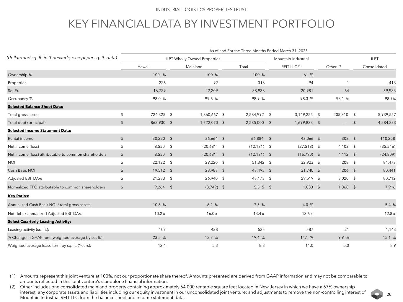 25 INDUSTRIAL LOGISTICS PROPERTIES TRUST For the Three Months Ended 3/31/2023 12/31/2022 9/30/2022 6/30/2022 3/31/2022 Net loss attributable to common shareholders $ (24,809) $ (31,043) $ (45,627) $ (143,539) $ (6,514) Depreciation and amortization 45,457 46,886 48,519 42,699 22,878 Equity in earnings of unconsolidated joint venture (3,961) (444) (3,297) (1,610) (1,727) Realized loss (gain) on sale of equity securities — — — 9,450 (1,232) Unrealized loss on equity securities — — — — (2,460) Share of FFO from unconsolidated joint venture 1,468 1,291 1,678 1,676 1,761 Loss on impairment of real estate — — — 100,747 — Loss on sale of real estate 974 — — 10 — FFO adjustments attributable to noncontrolling interest (11,213) (11,250) (11,407) (11,434) (4,604) FFO attributable to common shareholders 7,916 5,440 (10,134) (2,001) 8,102 Loss on early extinguishment of debt — — 21,370 — 828 Acquisition, transaction related and certain other financing costs (1) — — 32,016 30,303 18,673 Normalized FFO adjustments attributable to noncontrolling interest — — (28,379) — — Normalized FFO attributable to common shareholders $ 7,916 $ 5,440 $ 14,873 $ 28,302 $ 27,603 Weighted average common shares outstanding - basic and diluted 65,309 65,307 65,250 65,221 65,212 Per Common Share Data (basic and diluted): Net loss attributable to common shareholders (0.38) (0.48) (0.70) (2.20) (0.10) FFO attributable to common shareholders 0.12 0.08 (0.16) (0.03) 0.12 Normalized FFO attributable to common shareholders 0.12 0.08 0.23 0.43 0.42 CALCULATION OF FFO AND NORMALIZED FFO ATTRIBUTABLE TO COMMON SHAREHOLDERS (1) Amounts for the three months ended March 31, 2022, June 30, 2022 and September 30, 2022 primarily represent debt issuance costs recorded as interest expense related to certain financing and other transaction related costs expensed under GAAP. (dollars and shares in thousands, except per share data)