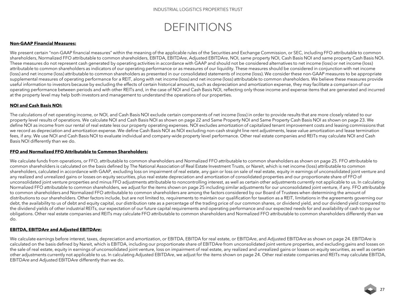 27 INDUSTRIAL LOGISTICS PROPERTIES TRUST DEFINITIONS Non-GAAP Financial Measures: We present certain “non-GAAP financial measures” within the meaning of the applicable rules of the Securities and Exchange Commission, or SEC, including FFO attributable to common shareholders, Normalized FFO attributable to common shareholders, EBITDA, EBITDAre, Adjusted EBITDAre, NOI, same property NOI, Cash Basis NOI and same property Cash Basis NOI. These measures do not represent cash generated by operating activities in accordance with GAAP and should not be considered alternatives to net income (loss) or net income (loss) attributable to common shareholders as indicators of our operating performance or as measures of our liquidity. These measures should be considered in conjunction with net income (loss) and net income (loss) attributable to common shareholders as presented in our consolidated statements of income (loss). We consider these non-GAAP measures to be appropriate supplemental measures of operating performance for a REIT, along with net income (loss) and net income (loss) attributable to common shareholders. We believe these measures provide useful information to investors because by excluding the effects of certain historical amounts, such as depreciation and amortization expense, they may facilitate a comparison of our operating performance between periods and with other REITs and, in the case of NOI and Cash Basis NOI, reflecting only those income and expense items that are generated and incurred at the property level may help both investors and management to understand the operations of our properties. NOI and Cash Basis NOI: The calculations of net operating income, or NOI, and Cash Basis NOI exclude certain components of net income (loss) in order to provide results that are more closely related to our property level results of operations. We calculate NOI and Cash Basis NOI as shown on page 22 and Same Property NOI and Same Property Cash Basis NOI as shown on page 23. We define NOI as income from our rental of real estate less our property operating expenses. NOI excludes amortization of capitalized tenant improvement costs and leasing commissions that we record as depreciation and amortization expense. We define Cash Basis NOI as NOI excluding non-cash straight line rent adjustments, lease value amortization and lease termination fees, if any. We use NOI and Cash Basis NOI to evaluate individual and company-wide property level performance. Other real estate companies and REITs may calculate NOI and Cash Basis NOI differently than we do. FFO and Normalized FFO Attributable to Common Shareholders: We calculate funds from operations, or FFO, attributable to common shareholders and Normalized FFO attributable to common shareholders as shown on page 25. FFO attributable to common shareholders is calculated on the basis defined by The National Association of Real Estate Investment Trusts, or Nareit, which is net income (loss) attributable to common shareholders, calculated in accordance with GAAP, excluding loss on impairment of real estate, any gain or loss on sale of real estate, equity in earnings of unconsolidated joint venture and any realized and unrealized gains or losses on equity securities, plus real estate depreciation and amortization of consolidated properties and our proportionate share of FFO of unconsolidated joint venture properties and minus FFO adjustments attributable to noncontrolling interest, as well as certain other adjustments currently not applicable to us. In calculating Normalized FFO attributable to common shareholders, we adjust for the items shown on page 25 including similar adjustments for our unconsolidated joint venture, if any. FFO attributable to common shareholders and Normalized FFO attributable to common shareholders are among the factors considered by our Board of Trustees when determining the amount of distributions to our shareholders. Other factors include, but are not limited to, requirements to maintain our qualification for taxation as a REIT, limitations in the agreements governing our debt, the availability to us of debt and equity capital, our distribution rate as a percentage of the trading price of our common shares, or dividend yield, and our dividend yield compared to the dividend yields of other industrial REITs, our expectation of our future capital requirements and operating performance and our expected needs for and availability of cash to pay our obligations. Other real estate companies and REITs may calculate FFO attributable to common shareholders and Normalized FFO attributable to common shareholders differently than we do. EBITDA, EBITDAre and Adjusted EBITDAre: We calculate earnings before interest, taxes, depreciation and amortization, or EBITDA, EBITDA for real estate, or EBITDAre, and Adjusted EBITDAre as shown on page 24. EBITDAre is calculated on the basis defined by Nareit, which is EBITDA, including our proportionate share of EBITDAre from unconsolidated joint venture properties, and excluding gains and losses on the sale of real estate, equity in earnings of unconsolidated joint venture, loss on impairment of real estate, any realized and unrealized gains or losses on equity securities, as well as certain other adjustments currently not applicable to us. In calculating Adjusted EBITDAre, we adjust for the items shown on page 24. Other real estate companies and REITs may calculate EBITDA, EBITDAre and Adjusted EBITDAre differently than we do.