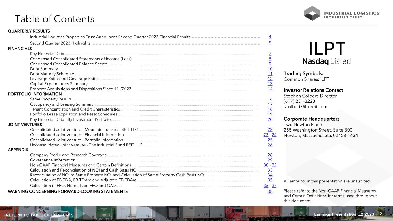 2Earnings Presentation Q2 2023RETURN TO TABLE OF CONTENTS QUARTERLY RESULTS Industrial Logistics Properties Trust Announces Second Quarter 2023 Financial Results ................................................. 4 Second Quarter 2023 Highlights ...................................................................................................................... 5 FINANCIALS Key Financial Data ............................................................................................................................................................................................... 7 Condensed Consolidated Statements of Income (Loss) .............................................................................................................................. 8 Condensed Consolidated Balance Sheets ..................................................................................................................................................... 9 Debt Summary .................................................................................................................................................................................................... 10 Debt Maturity Schedule ...................................................................................................................................................................................... 11 Leverage Ratios and Coverage Ratios ............................................................................................................................................................. 12 Capital Expenditures Summary ......................................................................................................................................................................... 13 Property Acquisitions and Dispositions Since 1/1/2023 .............................................................................................................................. 14 PORTFOLIO INFORMATION Same Property Results ........................................................................................................................................................................................ 16 Occupancy and Leasing Summary ................................................................................................................................................................... 17 Tenant Concentration and Credit Characteristics ......................................................................................................................................... 18 Portfolio Lease Expiration and Reset Schedules ........................................................................................................................................... 19 Key Financial Data - By Investment Portfolio .................................................................................................................................................. 20 JOINT VENTURES Consolidated Joint Venture - Mountain Industrial REIT LLC ....................................................................................................................... 22 Consolidated Joint Venture - Financial Information ..................................................................................................................................... 23 - 24 Consolidated Joint Venture - Portfolio Information ...................................................................................................................................... 25 Unconsolidated Joint Venture - The Industrial Fund REIT LLC ................................................................................................................... 26 APPENDIX Company Profile and Research Coverage ...................................................................................................................................................... 28 Governance Information .................................................................................................................................................................................... 29 Non-GAAP Financial Measures and Certain Definitions .............................................................................................................................. 30 - 32 Calculation and Reconciliation of NOI and Cash Basis NOI ........................................................................................................................ 33 Reconciliation of NOI to Same Property NOI and Calculation of Same Property Cash Basis NOI ...................................................... 34 Calculation of EBITDA, EBITDAre and Adjusted EBITDAre ......................................................................................................................... 35 Calculation of FFO, Normalized FFO and CAD ............................................................................................................................................. 36 - 37 WARNING CONCERNING FORWARD-LOOKING STATEMENTS 38 Table of Contents All amounts in this presentation are unaudited. Please refer to the Non-GAAP Financial Measures and Certain Definitions for terms used throughout this document. Trading Symbols: Common Shares: ILPT Investor Relations Contact Stephen Colbert, Director (617) 231-3223 scolbert@ilptreit.com Corporate Headquarters Two Newton Place 255 Washington Street, Suite 300 Newton, Massachusetts 02458-1634