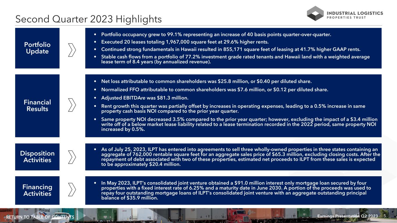 4Earnings Presentation Q2 2023RETURN TO TABLE OF CONTENTS "We remain encouraged by the continued demand for ILPT's high quality portfolio and the strength in industrial real estate fundamentals. We completed two million square feet of leasing, including rent resets, in the second quarter at weighted average rental rates that were 30% higher than prior rental rates for the same space. With no near-term debt maturities and a 99.1% occupied portfolio primarily leased to investment grade rated tenants, we continue to focus on enhancing ILPT's performance through embedded opportunities within the portfolio." Yael Duffy, President and Chief Operating Officer INDUSTRIAL LOGISTICS PROPERTIES TRUST ANNOUNCES SECOND QUARTER 2023 FINANCIAL RESULTS Newton, MA (July 25, 2023): Industrial Logistics Properties Trust (Nasdaq: ILPT) today announced its financial results for the quarter ended June 30, 2023. Dividend ILPT has declared a quarterly distribution on its common shares of $0.01 per share to shareholders of record as of the close of business on July 24, 2023. This distribution will be paid on or about August 17, 2023. Conference Call A conference call to discuss ILPT's second quarter results will be held on Wednesday, July 26, 2023 at 10:00 a.m. Eastern Time. The conference call may be accessed by dialing (877) 418-4826 or (412) 902-6758 (if calling from outside the United States and Canada); a pass code is not required. A replay will be available for one week by dialing (412) 317-0088; the replay pass code is 6832934. A live audio webcast of the conference call will also be available in a listen-only mode on ILPT’s website, at www.ilptreit.com. The archived webcast will be available for replay on ILPT’s website after the call. The transcription, recording and retransmission in any way are strictly prohibited without the prior written consent of ILPT. About Industrial Logistics Properties Trust Industrial Logistics Properties Trust (Nasdaq: ILPT) is a real estate investment trust, or REIT, focused on owning and leasing high quality distribution and logistics properties that serve the growing needs of e-commerce. As of June 30, 2023, ILPT’s portfolio consisted of 413 properties containing approximately 60.0 million rentable square feet located in 39 states. Approximately 77% of ILPT’s annualized rental revenues as of June 30, 2023 are derived from investment grade tenants, tenants that are subsidiaries of investment grade rated entities or Hawaii land leases. ILPT is managed by The RMR Group (Nasdaq: RMR), a leading U.S. alternative asset management company with approximately $36 billion in assets under management as of June 30, 2023 and more than 35 years of institutional experience in buying, selling, financing and operating commercial real estate. ILPT is headquartered in Newton, MA. For more information, visit www.ilptreit.com.
