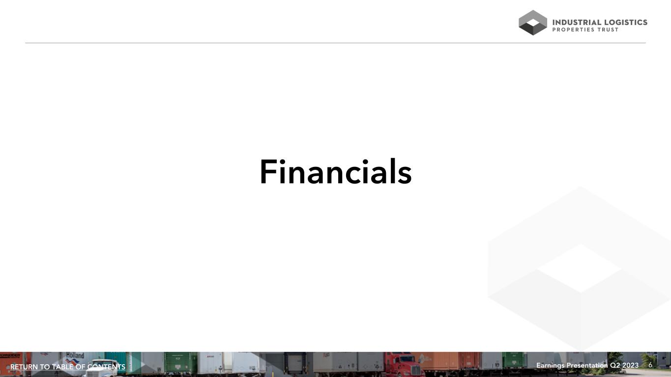 5Earnings Presentation Q2 2023RETURN TO TABLE OF CONTENTS Portfolio Update • Portfolio occupancy grew to 99.1% representing an increase of 40 basis points quarter-over-quarter. • Executed 20 leases totaling 1,967,000 square feet at 29.6% higher rents. • Continued strong fundamentals in Hawaii resulted in 855,171 square feet of leasing at 41.7% higher GAAP rents. • Stable cash flows from a portfolio of 77.2% investment grade rated tenants and Hawaii land with a weighted average lease term of 8.4 years (by annualized revenue). Financial Results • Net loss attributable to common shareholders was $25.8 million, or $0.40 per diluted share. • Normalized FFO attributable to common shareholders was $7.6 million, or $0.12 per diluted share. • Adjusted EBITDAre was $81.3 million. • Rent growth this quarter was partially offset by increases in operating expenses, leading to a 0.5% increase in same property cash basis NOI compared to the prior year quarter. • Same property NOI decreased 3.5% compared to the prior year quarter; however, excluding the impact of a $3.4 million write off of a below market lease liability related to a lease termination recorded in the 2022 period, same property NOI increased by 0.5%. Disposition Activities • As of July 25, 2023, ILPT has entered into agreements to sell three wholly-owned properties in three states containing an aggregate of 762,000 rentable square feet for an aggregate sales price of $65.3 million, excluding closing costs. After the repayment of debt associated with two of these properties, estimated net proceeds to ILPT from these sales is expected to be approximately $20.4 million. Financing Activities • In May 2023, ILPT’s consolidated joint venture obtained a $91.0 million interest only mortgage loan secured by four properties with a fixed interest rate of 6.25% and a maturity date in June 2030. A portion of the proceeds was used to repay four outstanding mortgage loans of ILPT’s consolidated joint venture with an aggregate outstanding principal balance of $35.9 million. Second Quarter 2023 Highlights