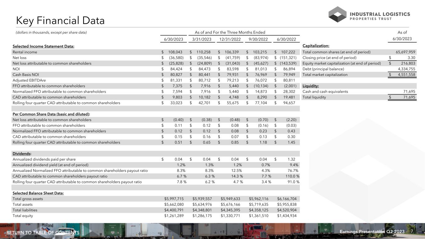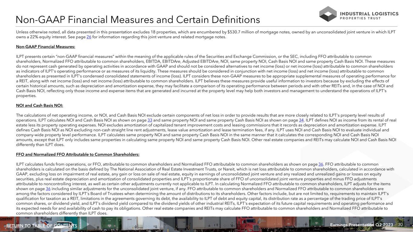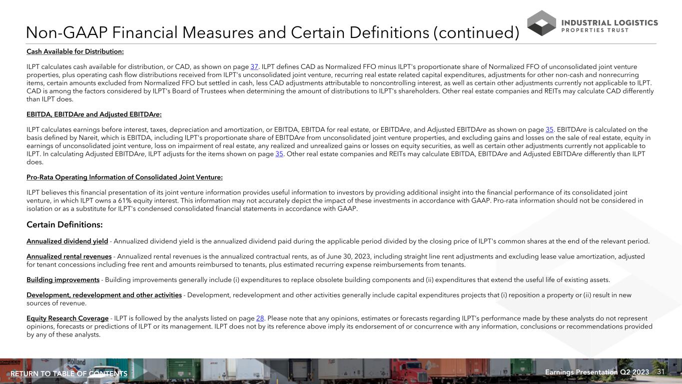 30Earnings Presentation Q2 2023RETURN TO TABLE OF CONTENTS Unless otherwise noted, all data presented in this presentation excludes 18 properties, which are encumbered by $530.7 million of mortgage notes, owned by an unconsolidated joint venture in which ILPT owns a 22% equity interest. See page 26 for information regarding this joint venture and related mortgage notes. Non-GAAP Financial Measures: ILPT presents certain “non-GAAP financial measures” within the meaning of the applicable rules of the Securities and Exchange Commission, or the SEC, including FFO attributable to common shareholders, Normalized FFO attributable to common shareholders, EBITDA, EBITDAre, Adjusted EBITDAre, NOI, same property NOI, Cash Basis NOI and same property Cash Basis NOI. These measures do not represent cash generated by operating activities in accordance with GAAP and should not be considered alternatives to net income (loss) or net income (loss) attributable to common shareholders as indicators of ILPT's operating performance or as measures of its liquidity. These measures should be considered in conjunction with net income (loss) and net income (loss) attributable to common shareholders as presented in ILPT's condensed consolidated statements of income (loss). ILPT considers these non-GAAP measures to be appropriate supplemental measures of operating performance for a REIT, along with net income (loss) and net income (loss) attributable to common shareholders. ILPT believes these measures provide useful information to investors because by excluding the effects of certain historical amounts, such as depreciation and amortization expense, they may facilitate a comparison of its operating performance between periods and with other REITs and, in the case of NOI and Cash Basis NOI, reflecting only those income and expense items that are generated and incurred at the property level may help both investors and management to understand the operations of ILPT's properties. NOI and Cash Basis NOI: The calculations of net operating income, or NOI, and Cash Basis NOI exclude certain components of net loss in order to provide results that are more closely related to ILPT's property level results of operations. ILPT calculates NOI and Cash Basis NOI as shown on page 33 and same property NOI and same property Cash Basis NOI as shown on page 34. ILPT defines NOI as income from its rental of real estate less its property operating expenses. NOI excludes amortization of capitalized tenant improvement costs and leasing commissions that it records as depreciation and amortization expense. ILPT defines Cash Basis NOI as NOI excluding non-cash straight line rent adjustments, lease value amortization and lease termination fees, if any. ILPT uses NOI and Cash Basis NOI to evaluate individual and company-wide property level performance. ILPT calculates same property NOI and same property Cash Basis NOI in the same manner that it calculates the corresponding NOI and Cash Basis NOI amounts, except that ILPT only includes same properties in calculating same property NOI and same property Cash Basis NOI. Other real estate companies and REITs may calculate NOI and Cash Basis NOI differently than ILPT does. FFO and Normalized FFO Attributable to Common Shareholders: ILPT calculates funds from operations, or FFO, attributable to common shareholders and Normalized FFO attributable to common shareholders as shown on page 36. FFO attributable to common shareholders is calculated on the basis defined by The National Association of Real Estate Investment Trusts, or Nareit, which is net loss attributable to common shareholders, calculated in accordance with GAAP, excluding loss on impairment of real estate, any gain or loss on sale of real estate, equity in earnings of unconsolidated joint venture and any realized and unrealized gains or losses on equity securities, plus real estate depreciation and amortization of consolidated properties and ILPT's proportionate share of FFO of unconsolidated joint venture properties and minus FFO adjustments attributable to noncontrolling interest, as well as certain other adjustments currently not applicable to ILPT. In calculating Normalized FFO attributable to common shareholders, ILPT adjusts for the items shown on page 36 including similar adjustments for the unconsolidated joint venture, if any. FFO attributable to common shareholders and Normalized FFO attributable to common shareholders are among the factors considered by ILPT's Board of Trustees when determining the amount of distributions to its shareholders. Other factors include, but are not limited to, requirements to maintain ILPT's qualification for taxation as a REIT, limitations in the agreements governing its debt, the availability to ILPT of debt and equity capital, its distribution rate as a percentage of the trading price of ILPT's common shares, or dividend yield, and ILPT's dividend yield compared to the dividend yields of other industrial REITs, ILPT's expectation of its future capital requirements and operating performance and its expected needs for and availability of cash to pay its obligations. Other real estate companies and REITs may calculate FFO attributable to common shareholders and Normalized FFO attributable to common shareholders differently than ILPT does. Non-GAAP Financial Measures and Certain Definitions