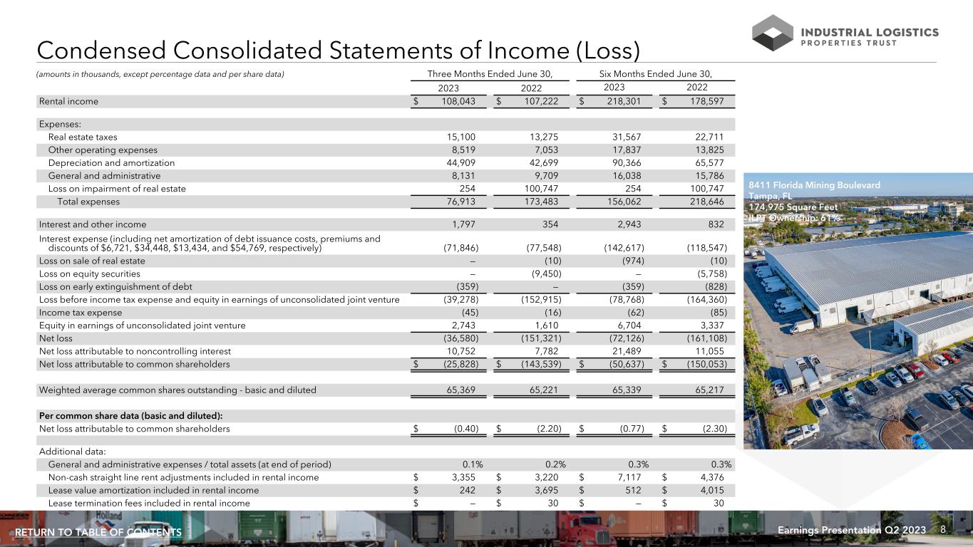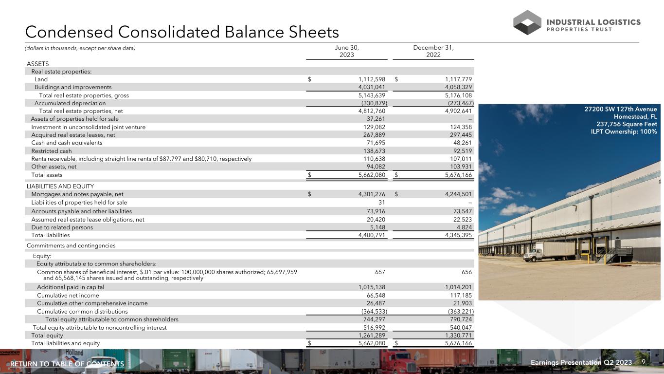 8Earnings Presentation Q2 2023RETURN TO TABLE OF CONTENTS Condensed Consolidated Statements of Income (Loss) Three Months Ended June 30, Six Months Ended June 30, 2023 2022 2023 2022 Rental income $ 108,043 $ 107,222 $ 218,301 $ 178,597 Expenses: Real estate taxes 15,100 13,275 31,567 22,711 Other operating expenses 8,519 7,053 17,837 13,825 Depreciation and amortization 44,909 42,699 90,366 65,577 General and administrative 8,131 9,709 16,038 15,786 Loss on impairment of real estate 254 100,747 254 100,747 Total expenses 76,913 173,483 156,062 218,646 Interest and other income 1,797 354 2,943 832 Interest expense (including net amortization of debt issuance costs, premiums and discounts of $6,721, $34,448, $13,434, and $54,769, respectively) (71,846) (77,548) (142,617) (118,547) Loss on sale of real estate — (10) (974) (10) Loss on equity securities — (9,450) — (5,758) Loss on early extinguishment of debt (359) — (359) (828) Loss before income tax expense and equity in earnings of unconsolidated joint venture (39,278) (152,915) (78,768) (164,360) Income tax expense (45) (16) (62) (85) Equity in earnings of unconsolidated joint venture 2,743 1,610 6,704 3,337 Net loss (36,580) (151,321) (72,126) (161,108) Net loss attributable to noncontrolling interest 10,752 7,782 21,489 11,055 Net loss attributable to common shareholders $ (25,828) $ (143,539) $ (50,637) $ (150,053) Weighted average common shares outstanding - basic and diluted 65,369 65,221 65,339 65,217 Per common share data (basic and diluted): Net loss attributable to common shareholders $ (0.40) $ (2.20) $ (0.77) $ (2.30) Additional data: General and administrative expenses / total assets (at end of period) 0.1% 0.2% 0.3% 0.3% Non-cash straight line rent adjustments included in rental income $ 3,355 $ 3,220 $ 7,117 $ 4,376 Lease value amortization included in rental income $ 242 $ 3,695 $ 512 $ 4,015 Lease termination fees included in rental income $ — $ 30 $ — $ 30 (amounts in thousands, except percentage data and per share data) 8411 Florida Mining Boulevard Tampa, FL 174,975 Square Feet ILPT Ownership: 61%
