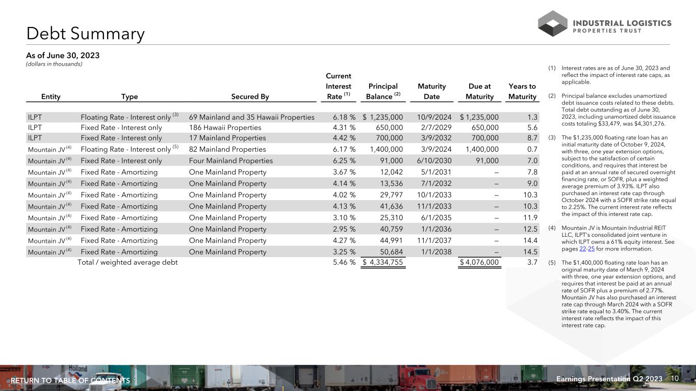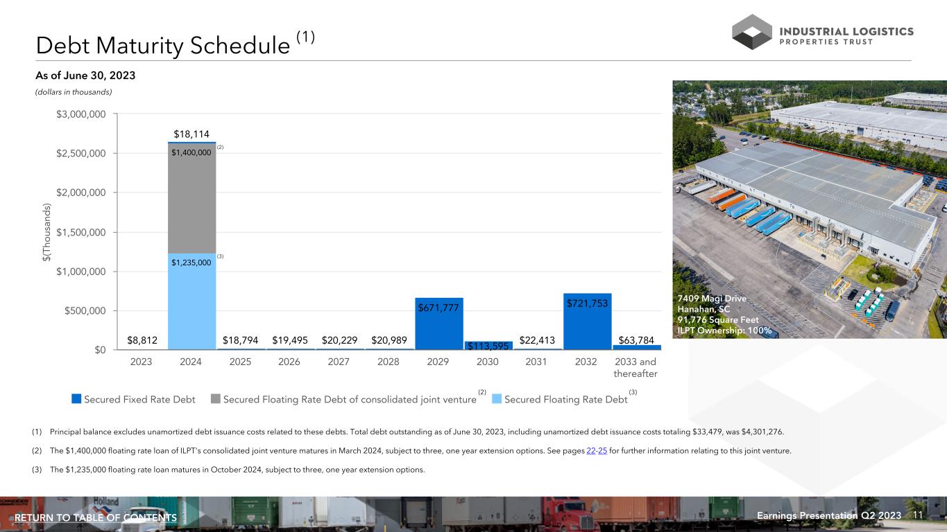 10Earnings Presentation Q2 2023RETURN TO TABLE OF CONTENTS (1) Interest rates are as of June 30, 2023 and reflect the impact of interest rate caps, as applicable. (2) Principal balance excludes unamortized debt issuance costs related to these debts. Total debt outstanding as of June 30, 2023, including unamortized debt issuance costs totaling $33,479, was $4,301,276. (3) The $1,235,000 floating rate loan has an initial maturity date of October 9, 2024, with three, one year extension options, subject to the satisfaction of certain conditions, and requires that interest be paid at an annual rate of secured overnight financing rate, or SOFR, plus a weighted average premium of 3.93%. ILPT also purchased an interest rate cap through October 2024 with a SOFR strike rate equal to 2.25%. The current interest rate reflects the impact of this interest rate cap. (4) Mountain JV is Mountain Industrial REIT LLC, ILPT's consolidated joint venture in which ILPT owns a 61% equity interest. See pages 22-25 for more information. (5) The $1,400,000 floating rate loan has an original maturity date of March 9, 2024 with three, one year extension options, and requires that interest be paid at an annual rate of SOFR plus a premium of 2.77%. Mountain JV has also purchased an interest rate cap through March 2024 with a SOFR strike rate equal to 3.40%. The current interest rate reflects the impact of this interest rate cap. Current Interest Principal Maturity Due at Years to Entity Type Secured By Rate (1) Balance (2) Date Maturity Maturity ILPT Floating Rate - Interest only (3) 69 Mainland and 35 Hawaii Properties 6.18 % $ 1,235,000 10/9/2024 $ 1,235,000 1.3 ILPT Fixed Rate - Interest only 186 Hawaii Properties 4.31 % 650,000 2/7/2029 650,000 5.6 ILPT Fixed Rate - Interest only 17 Mainland Properties 4.42 % 700,000 3/9/2032 700,000 8.7 Mountain JV (4) Floating Rate - Interest only (5) 82 Mainland Properties 6.17 % 1,400,000 3/9/2024 1,400,000 0.7 Mountain JV (4) Fixed Rate - Interest only Four Mainland Properties 6.25 % 91,000 6/10/2030 91,000 7.0 Mountain JV (4) Fixed Rate - Amortizing One Mainland Property 3.67 % 12,042 5/1/2031 — 7.8 Mountain JV (4) Fixed Rate - Amortizing One Mainland Property 4.14 % 13,536 7/1/2032 — 9.0 Mountain JV (4) Fixed Rate - Amortizing One Mainland Property 4.02 % 29,797 10/1/2033 — 10.3 Mountain JV (4) Fixed Rate - Amortizing One Mainland Property 4.13 % 41,636 11/1/2033 — 10.3 Mountain JV (4) Fixed Rate - Amortizing One Mainland Property 3.10 % 25,310 6/1/2035 — 11.9 Mountain JV (4) Fixed Rate - Amortizing One Mainland Property 2.95 % 40,759 1/1/2036 — 12.5 Mountain JV (4) Fixed Rate - Amortizing One Mainland Property 4.27 % 44,991 11/1/2037 — 14.4 Mountain JV (4) Fixed Rate - Amortizing One Mainland Property 3.25 % 50,684 1/1/2038 — 14.5 Total / weighted average debt 5.46 % $ 4,334,755 $ 4,076,000 3.7 Debt Summary (dollars in thousands) As of June 30, 2023