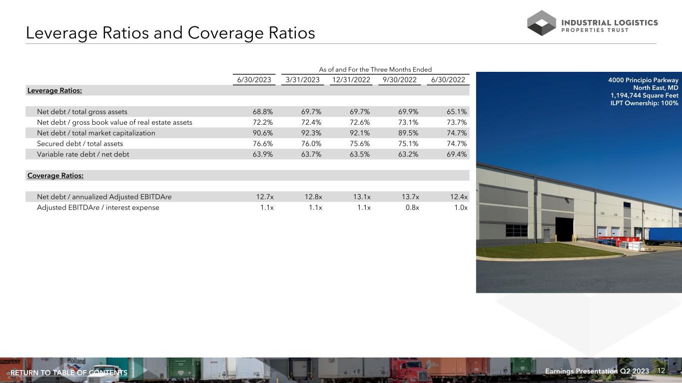 11Earnings Presentation Q2 2023RETURN TO TABLE OF CONTENTS (1) Principal balance excludes unamortized debt issuance costs related to these debts. Total debt outstanding as of June 30, 2023, including unamortized debt issuance costs totaling $33,479, was $4,301,276. (2) The $1,400,000 floating rate loan of ILPT's consolidated joint venture matures in March 2024, subject to three, one year extension options. See pages 22-25 for further information relating to this joint venture. (3) The $1,235,000 floating rate loan matures in October 2024, subject to three, one year extension options. Debt Maturity Schedule (1) (dollars in thousands) As of June 30, 2023 $( Th ou sa nd s) $1,235,000 $1,400,000 $8,812 $18,114 $18,794 $19,495 $20,229 $20,989 $671,777 $113,595 $22,413 $721,753 $63,784 Secured Fixed Rate Debt Secured Floating Rate Debt of consolidated joint venture Secured Floating Rate Debt 2023 2024 2025 2026 2027 2028 2029 2030 2031 2032 2033 and thereafter $0 $500,000 $1,000,000 $1,500,000 $2,000,000 $2,500,000 $3,000,000 (2) (3) 7409 Magi Drive Hanahan, SC 91,776 Square Feet ILPT Ownership: 100% (3) (2)