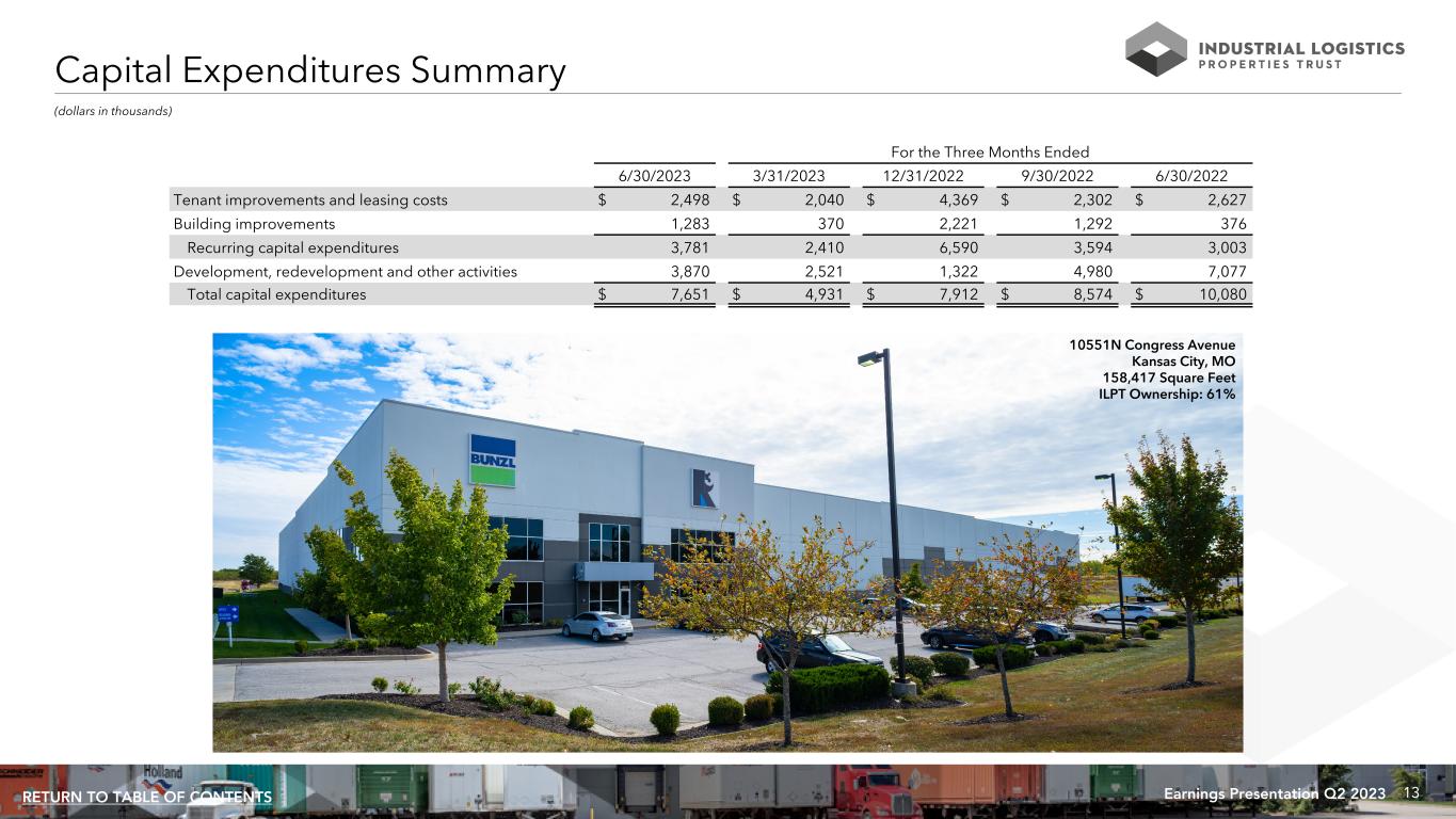 12Earnings Presentation Q2 2023RETURN TO TABLE OF CONTENTS As of and For the Three Months Ended 6/30/2023 3/31/2023 12/31/2022 9/30/2022 6/30/2022 Leverage Ratios: Net debt / total gross assets 68.8% 69.7% 69.7% 69.9% 65.1% Net debt / gross book value of real estate assets 72.2% 72.4% 72.6% 73.1% 73.7% Net debt / total market capitalization 90.6% 92.3% 92.1% 89.5% 74.7% Secured debt / total assets 76.6% 76.0% 75.6% 75.1% 74.7% Variable rate debt / net debt 63.9% 63.7% 63.5% 63.2% 69.4% Coverage Ratios: Net debt / annualized Adjusted EBITDAre 12.7x 12.8x 13.1x 13.7x 12.4x Adjusted EBITDAre / interest expense 1.1x 1.1x 1.1x 0.8x 1.0x Leverage Ratios and Coverage Ratios 4000 Principio Parkway North East, MD 1,194,744 Square Feet ILPT Ownership: 100%