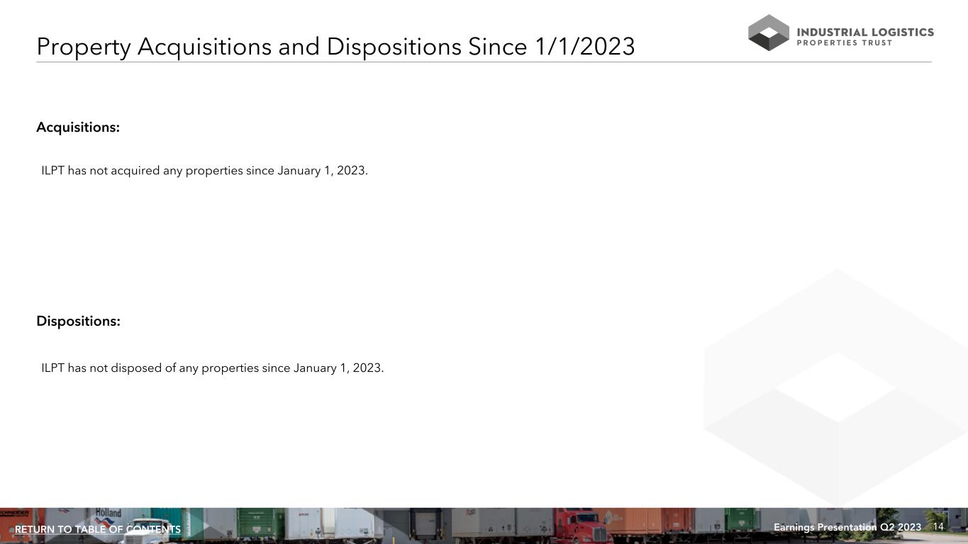 38Earnings Presentation Q2 2023RETURN TO TABLE OF CONTENTS Warning Concerning Forward-Looking Statements This presentation contains forward-looking statements within the meaning of the Private Securities Litigation Reform Act of 1995 and other securities laws that are subject to risks and uncertainties. These statements may include words such as “believe”, “expect”, “anticipate”, “intend”, “plan”, “estimate”, “will”, “may” and negatives or derivatives of these or similar expressions. These forward-looking statements include, among others, statements about: demand for ILPT's properties; strength in industrial real estate fundamentals; opportunities ILPT believes exist for its portfolio; ILPT's disposition activities; an implied assumption that ILPT's Mountain JV will exercise its option to extend the maturity date of its $1.4 billion floating rate loan; and its capital expenditure plans and commitments. Forward-looking statements reflect ILPT’s current expectations, are based on judgments and assumptions, are inherently uncertain and are subject to risks, uncertainties and other factors, which could cause ILPT’s actual results, performance or achievements to differ materially from expected future results, performance or achievements expressed or implied in those forward-looking statements. Some of the risks, uncertainties and other factors that may cause its actual results, performance or achievements to differ materially from those expressed or implied by forward-looking statements include, but are not limited to, the following: ILPT’s ability and the ability of its tenants to operate under unfavorable market and economic conditions, such as rising or sustained high interest rates, high inflation, labor market challenges, dislocation and volatility in the public equity and debt markets, challenges in the commercial real estate industry generally and in the industrial and logistics sector, geopolitical instability and economic recessions or downturns; demand for industrial and logistics properties; ILPT’s ability to reduce its leverage, generate cash flow and take advantage of mark-to-market leasing opportunities; ILPT’s ability to cost-effectively raise and balance its use of debt or equity capital; ILPT’s ability to pay interest on and principal of its debt; ILPT’s ability to maintain sufficient liquidity; ILPT’s tenants’ ability and willingness to pay their rent obligations to ILPT; ILPT’s ability to successfully compete for tenancies, the likelihood that the rents it realizes will increase when ILPT renews or extends its leases, enters new leases, or its rents reset at ILPT’s properties in Hawaii; whether ILPT's tenants will renew or extend their leases or that ILPT will be able to obtain replacement tenants on terms as favorable to it as the terms of its existing leases; the credit qualities of ILPT’s tenants; changes in the security of cash flows from ILPT’s properties; ILPT’s ability to maintain high occupancy at its properties; its tenant and geographic concentrations, potential defaults of its leases by its tenants; changes in global supply chain conditions and emerging technologies; whether the industrial and logistics sector and the extent to which ILPT’s tenants' businesses are critical to sustaining a resilient supply chain and that ILPT's business will benefit as a result; ILPT’s ability to pay distributions to its shareholders and to increase or sustain the amount of such distributions; ILPT’s ability to acquire properties that realize ILPT's targeted returns; ILPT’s ability to sell properties at prices it targets; ILPT’s ability to prudently pursue, and successfully and profitably complete, expansion and renovation projects at its properties and to realize its expected returns on those projects; ILPT’s ability to sell additional equity interests in, or contribute additional properties to, its existing joint ventures, or enter into additional, real estate joint ventures or to attract co-venturers and benefit from its existing joint ventures or any real estate joint ventures ILPT may enter into; the ability of ILPT’s manager, RMR, to successfully manage it; ILPT’s qualification for taxation as a REIT under the Internal Revenue Code of 1986, as amended; changes in federal or state tax laws; changes in environmental laws or in their interpretations or enforcement as a result of climate change or otherwise, or ILPT incurring environmental remediation costs or other liabilities; ILPT's expected capital expenditures and leasing costs, as well as risks and uncertainties regarding the development, redevelopment or repositioning of ILPT's properties, including as a result of inflation, cost overruns, supply chain challenges, labor shortages, construction delays or inability to obtain necessary permits, and ILPT’s ability to lease space at these properties at targeted returns; competition within the commercial real estate industry, particularly for industrial and logistics properties in those markets in which ILPT’s properties are located; compliance with, and changes to, federal, state and local laws and regulations, accounting rules, tax laws and similar matters; limitations imposed on ILPT’s business and its ability to satisfy complex rules in order for ILPT to maintain its qualification for taxation as a REIT for U.S. federal income tax purposes; non-performance by the counterparties to its interest rate caps and the costs for renewing or replacing the interest rate caps; actual and potential conflicts of interest with ILPT’s related parties, including its managing trustees, RMR and others affiliated with them; acts of terrorism, outbreaks or continuation of pandemics or other significant adverse public health safety events or conditions, war or other hostilities, supply chain disruptions, climate change or other manmade or natural disasters beyond ILPT’s control; and other matters. These risks,