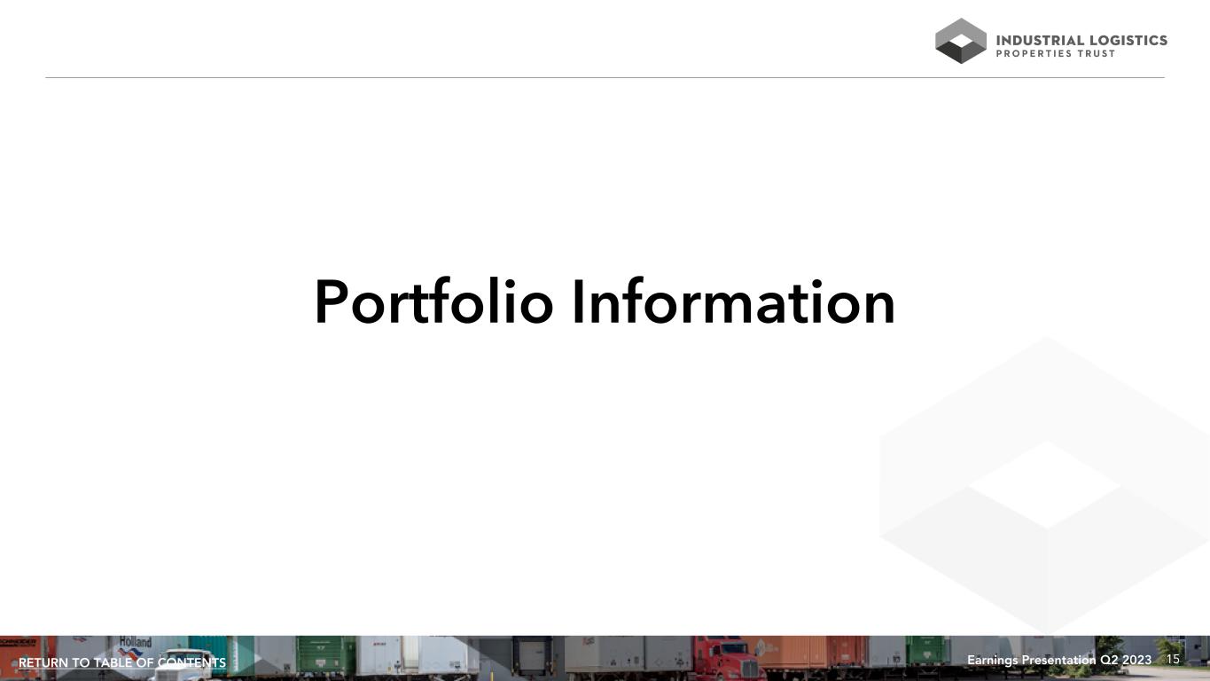 14Earnings Presentation Q2 2023RETURN TO TABLE OF CONTENTS Property Acquisitions and Dispositions Since 1/1/2023 Dispositions: ILPT has not disposed of any properties since January 1, 2023. Acquisitions: ILPT has not acquired any properties since January 1, 2023.