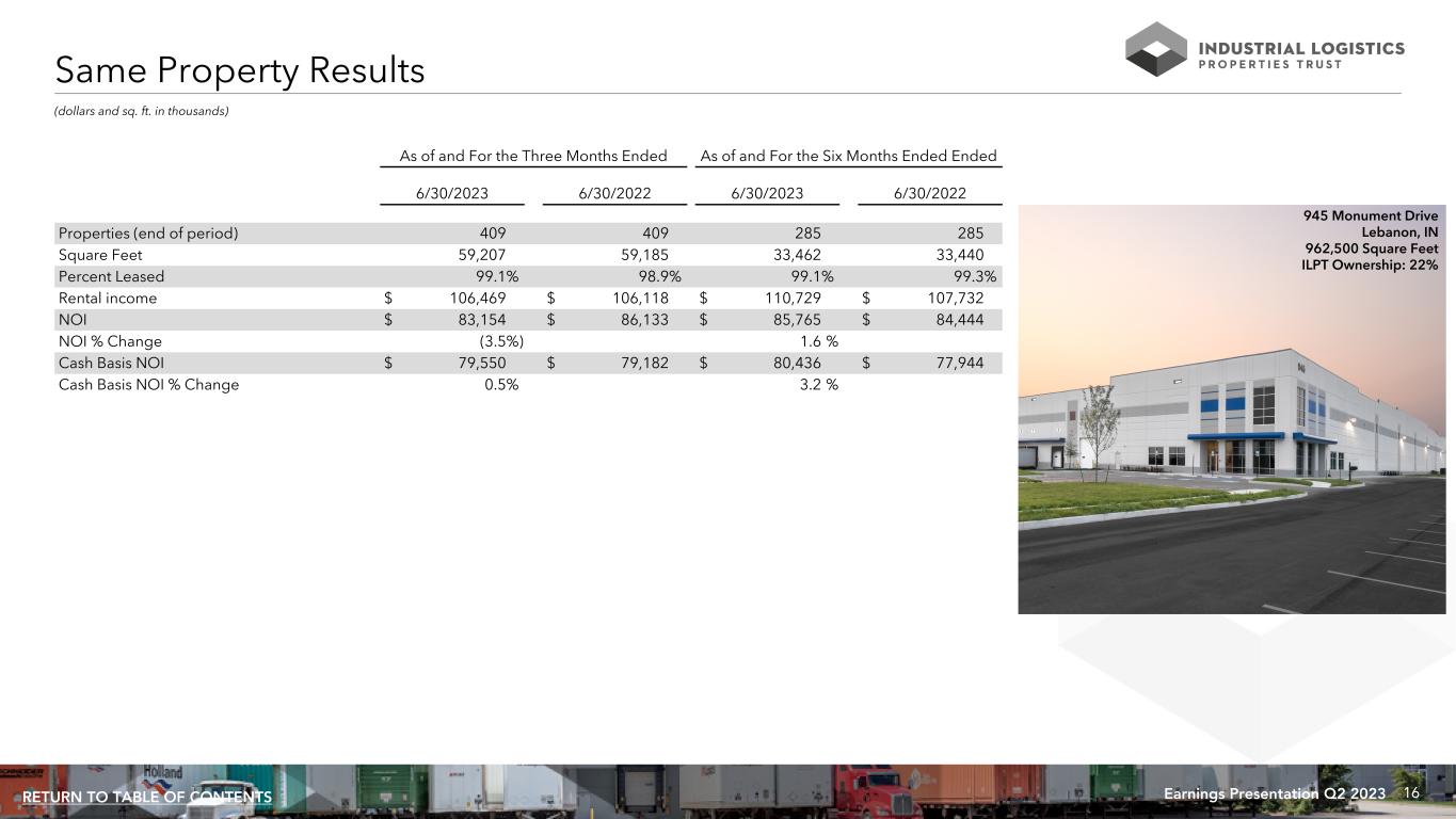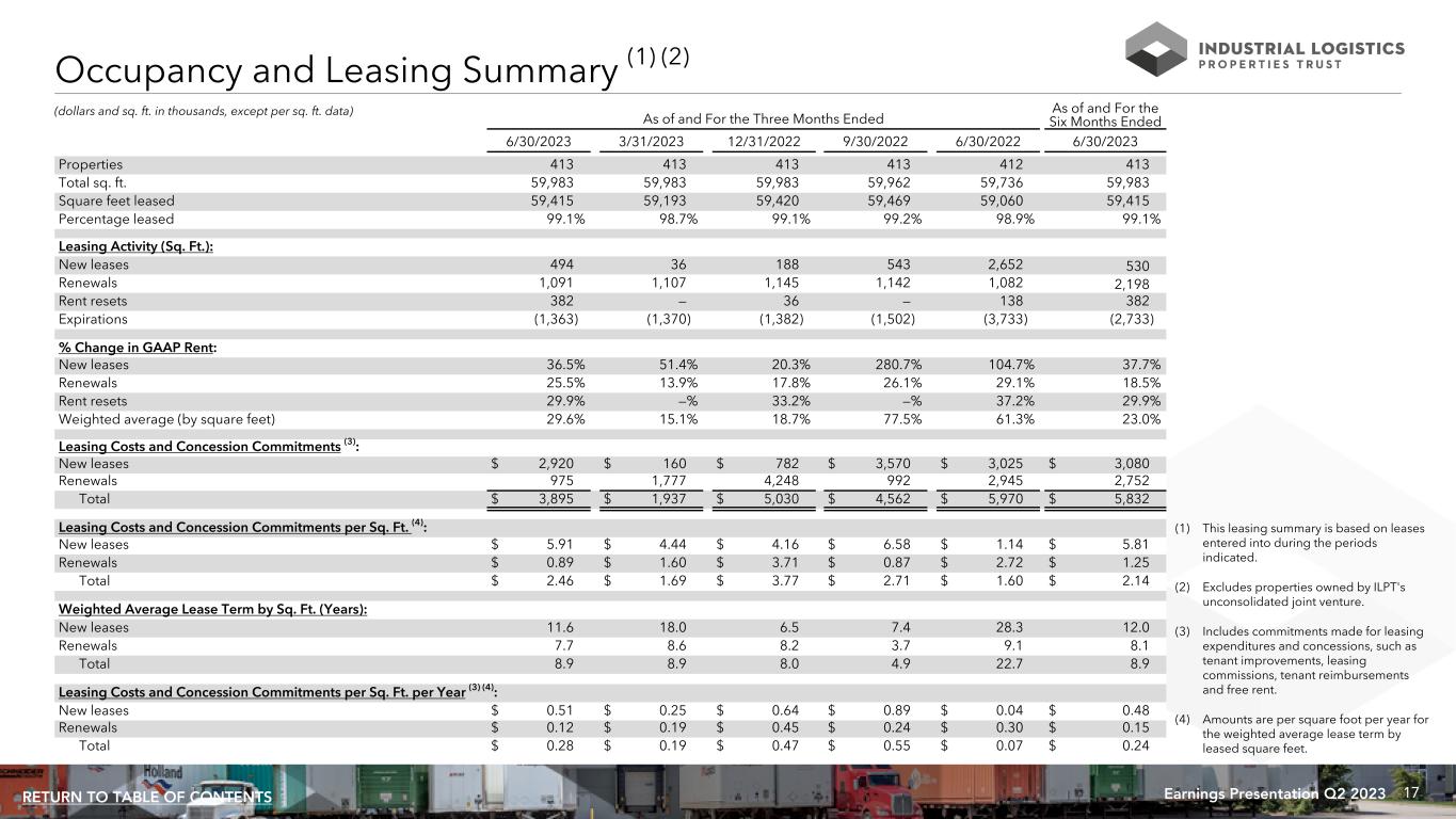 16Earnings Presentation Q2 2023RETURN TO TABLE OF CONTENTS (dollars and sq. ft. in thousands) As of and For the Three Months Ended As of and For the Six Months Ended Ended 6/30/2023 6/30/2022 6/30/2023 6/30/2022 Properties (end of period) 409 409 285 285 Square Feet 59,207 59,185 33,462 33,440 Percent Leased 99.1% 98.9% 99.1% 99.3% Rental income $ 106,469 $ 106,118 $ 110,729 $ 107,732 NOI $ 83,154 $ 86,133 $ 85,765 $ 84,444 NOI % Change (3.5%) 1.6 % Cash Basis NOI $ 79,550 $ 79,182 $ 80,436 $ 77,944 Cash Basis NOI % Change 0.5% 3.2 % Same Property Results 945 Monument Drive Lebanon, IN 962,500 Square Feet ILPT Ownership: 22%